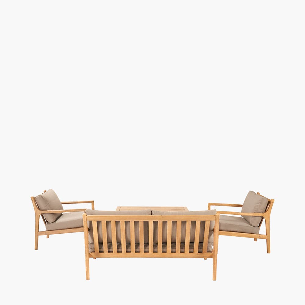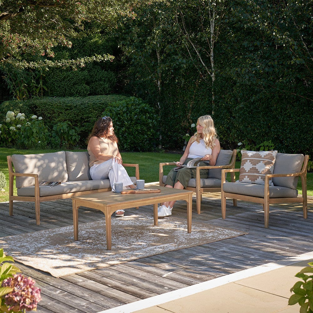 The set includes a 2-seater sofa, 2x armchairs, and a coffee table, that can complement an outdoor space or indoor setting alike and is equally perfect for use in a conservatory or garden room. The sleek, slimline acacia wood frame is an environmentally friendly choice as it is a quick growing wood, and also tough and long-lasting, making it an excellent choice for outdoor furniture.