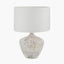 A curved elegant shape, this contemporary wood table lamp is made in India and has a mango wood base with a stunning hand-carved design across it, finished in a subtle whitewash. Finished with a modern white cylinder linen shade that is self-lined, with an open weave material that still allows the light to filter through.
