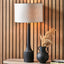 This tasteful black table lamp has the monochrome trend covered. Its the perfect addition to any room. Hand-finished in India, Its textured mango wood base and slender silhouette make for an elegant, stylish piece. Paired with a modern white cylinder linen shade that is self-lined, with an open weave material that allows the light to filter through for a soft glow.