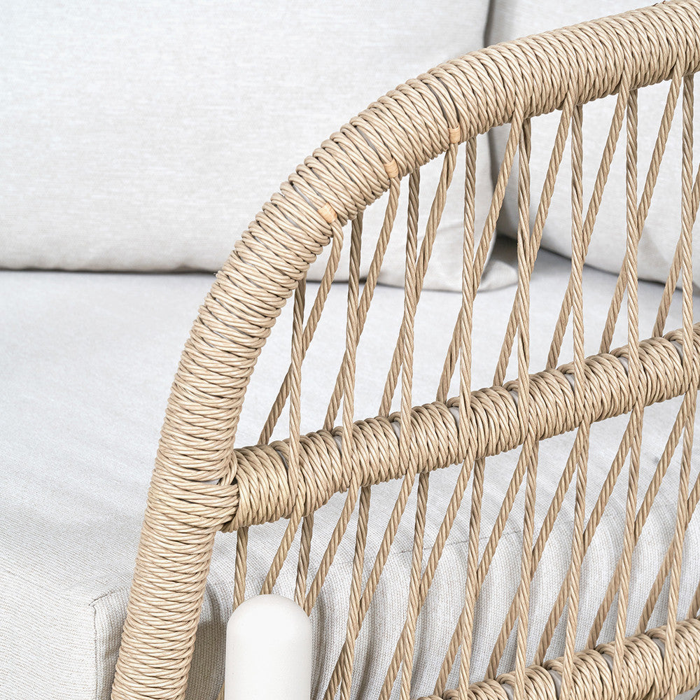 The Martic Outdoor 3 Seater Sofa is the perfect addition to any outdoor space. With its contemporary design and comfortable seating, it offers the ultimate lounging experience. This sofa is versatile and can be purchased in multiples to create a bespoke bistro setup. The Natural Synthetic Core Weave and powder-coated aluminium frame make it durable and long-lasting. The seat and back cushions are made of Light Putty Olefin fabric, known for its resistance to staining, fading, and quick drying. For added comfort, this set comes with additional scatters. To maintain its quality, we recommend using an Aerocover when not in use. This product also comes with a 3 Year Structural Guarantee. The dimensions of this sofa are W208xD80xH75cm. Shop now at House of Isabella for luxurious furniture and interiors with free UK delivery.