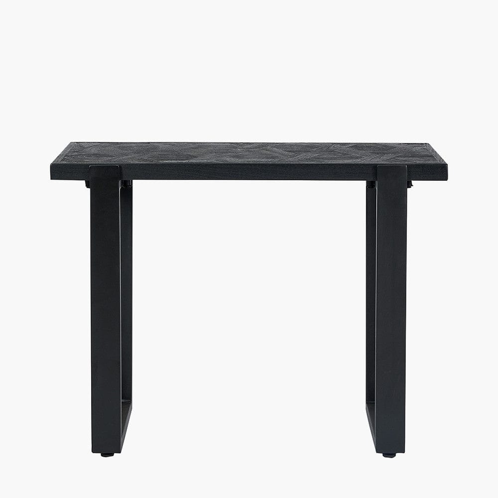 This sophisticated matt black mango wood and black metal console table will instantly create a focal point within your room. The beautifully crafted inlaid top has a geometric design that produces a tactility and texture to this otherwise sleek design. Matching dining table available.