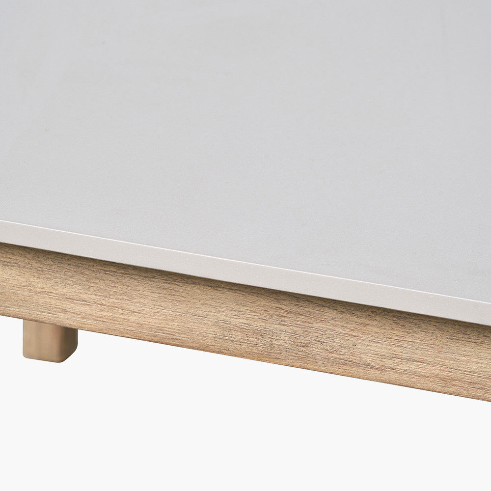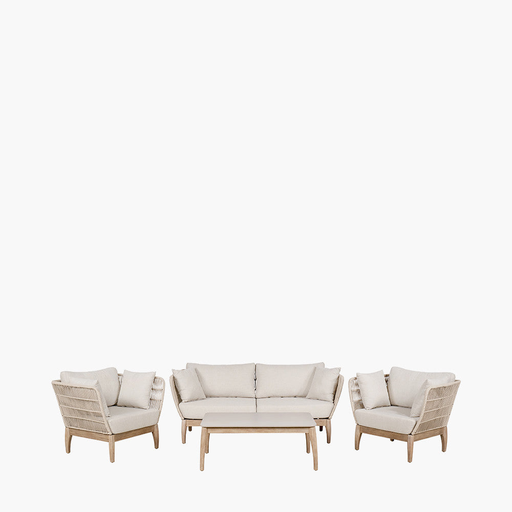 The Moeven Outdoor Seating Set is the perfect addition to any garden, providing a contemporary and comfortable design that will give your outdoor space a modern update. Crafted in Vietnam, this set features an antique effect acacia wood frame that not only adds style but is also environmentally friendly due to the fast-growing properties of the wood. The set includes a coffee table with a durable polystone table top in a cement colour, along with a comfortable sofa and armchairs featuring a latte polyrope weave and light linen natural oatmeal season-proof cushions. The cushions are made with Olefin fabric, a highly resistant material that is perfect for outdoor furniture as it is quick drying and resistant to staining and fading. To maintain the quality and fresh look of your set, we recommend using an Aerocover when not in use. This product also comes with a 3 Year Structural Guarantee* for added peace of mind. Features include a polyrope weave, weather resistant and UV protected materials, and a polystone table top. For maintenance instructions, please refer to our Outdoor Product Care Instructions.