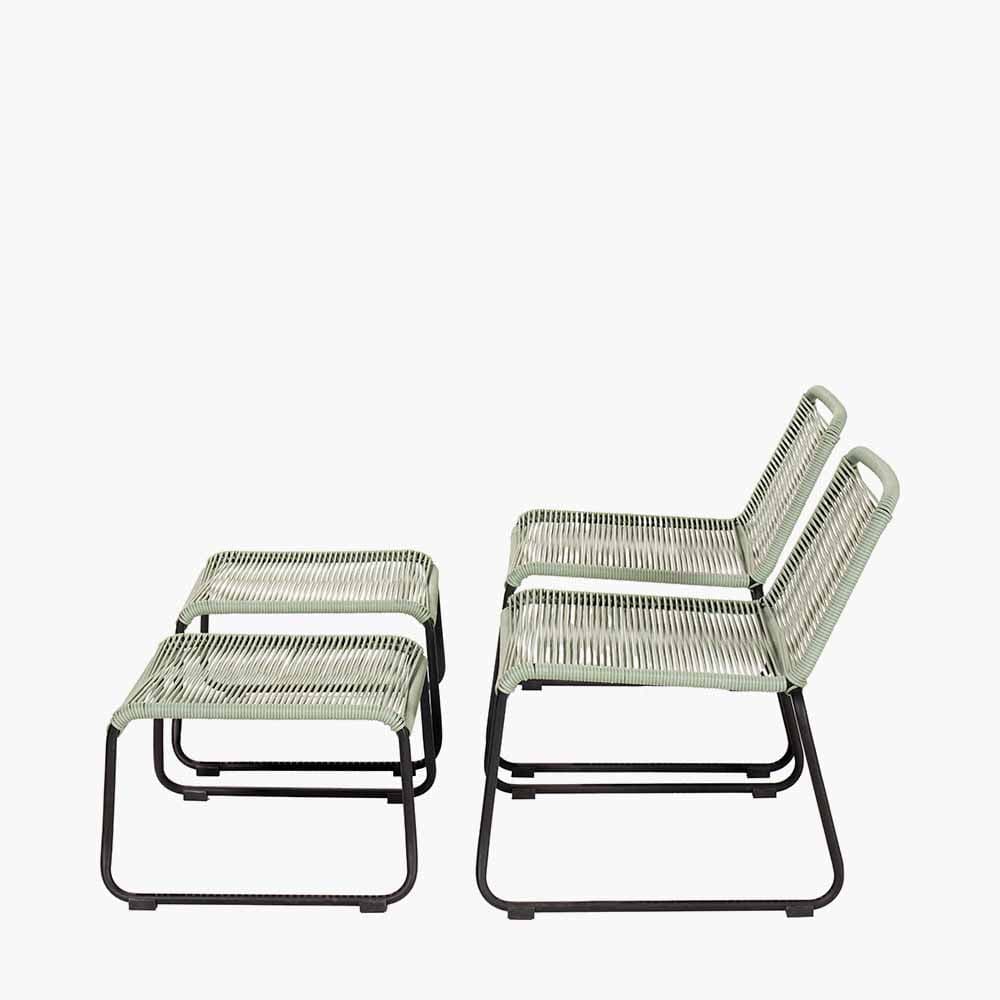 Introducing the Pang Wasabi 4 Piece Hocker Set, the perfect addition to your outdoor lounging area. Made in Vietnam, this set includes 2 green lounging chairs and 2 green footstools, all designed with comfort and style in mind. The chairs and footstools feature a cleverly designed polyrope in a simple openweave, ensuring even weight distribution on the black powder-coated steel frame. The Wasabi green coloured weave is weather resistant and non-porous, with a soft touch finish for maximum comfort. This set is perfect for smaller gardens or as additional pieces for a cosy reading nook. For added protection, a cover is available to order separately using the code 18-C-7908 :Set Aerocover. Don't forget to check out our recommended maintenance tips in our Outdoor Product Care Instructions. Enjoy luxurious furniture and interiors with free UK delivery from House of Isabella.