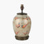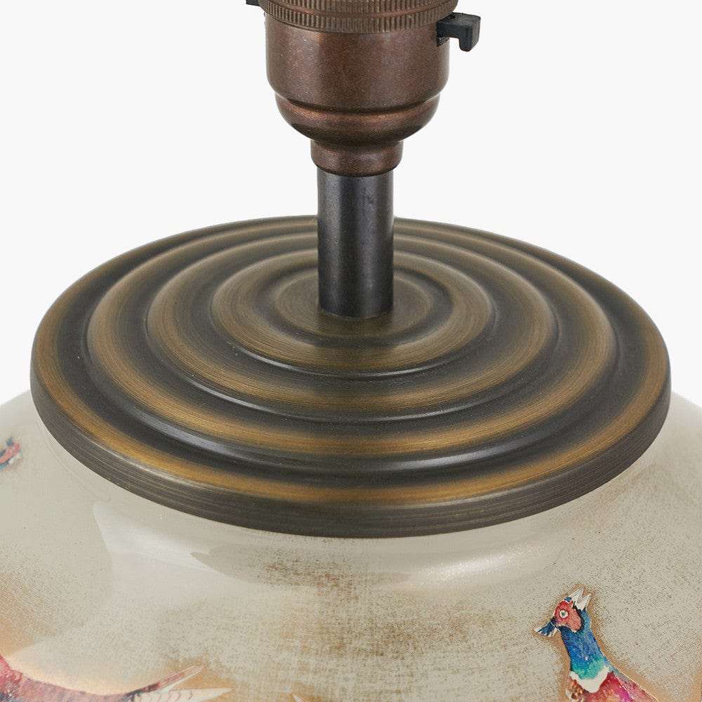 The iconic Jenny Worrall brand boasts a range of truly exquisite table lamp designs. Created using the traditional technique of potichomania, delicate decals are applied by hand within the base of the lamp. Each lamp design is then carefully built up with layers of hand-sponged lustre and colour to create the finished effect. The Pheasant design is pictured on a champagne gold-coloured background using a vibrant orange, pink and blue palette for the pheasants. The gold accenting gives the design depth and is synonymous with the Jenny Worrall brand. The glass is then completed with an antique brass finish base and top. The stunning glass table lamp base is styled with a beautifully rustic, open weave jute linen cylinder lamp shade to complete the look.