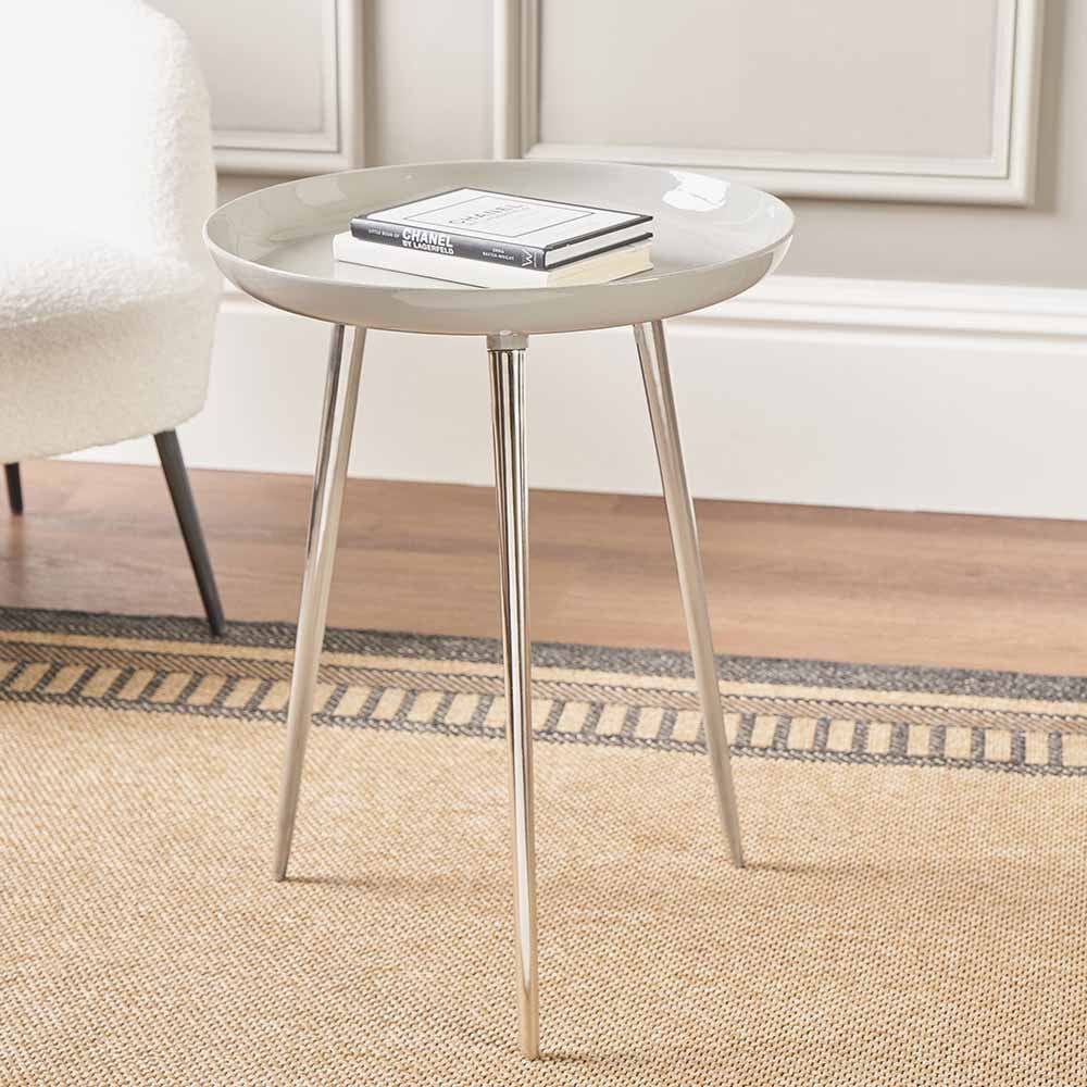 Elevate your space with our stunning Seline occasional side table, beautifully crafted in India. Characterised by its distinctive cast metal silver metallic legs and a sleek grey enamelled tabletop, this occasional table effortlessly adds a touch of sophistication and offers a subtle pop of colour to complement your space.