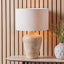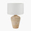 A tall, curved, elegant shape, this contemporary wood table lamp has a mango wood base with a hand carved linear design, finished in a subtle whitewash. Topped off with a white linen, open-weave, self-lined cylinder lamp shade this table lamp will be the focal point of your room.