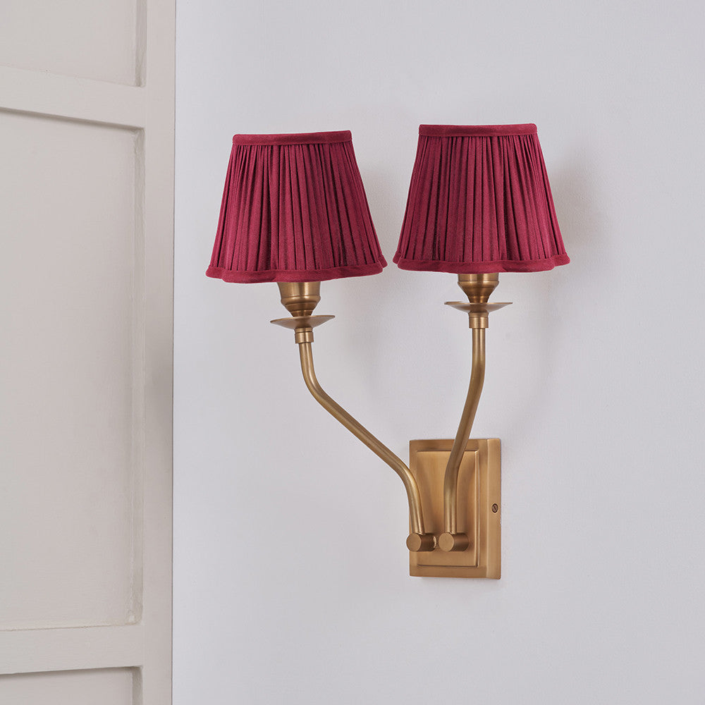 Tatiana Antique Brass Metal Double Wall Light with Malia 18cm Mulberry Red Mushroom Pleat Scalloped Tapered Lamp Shade