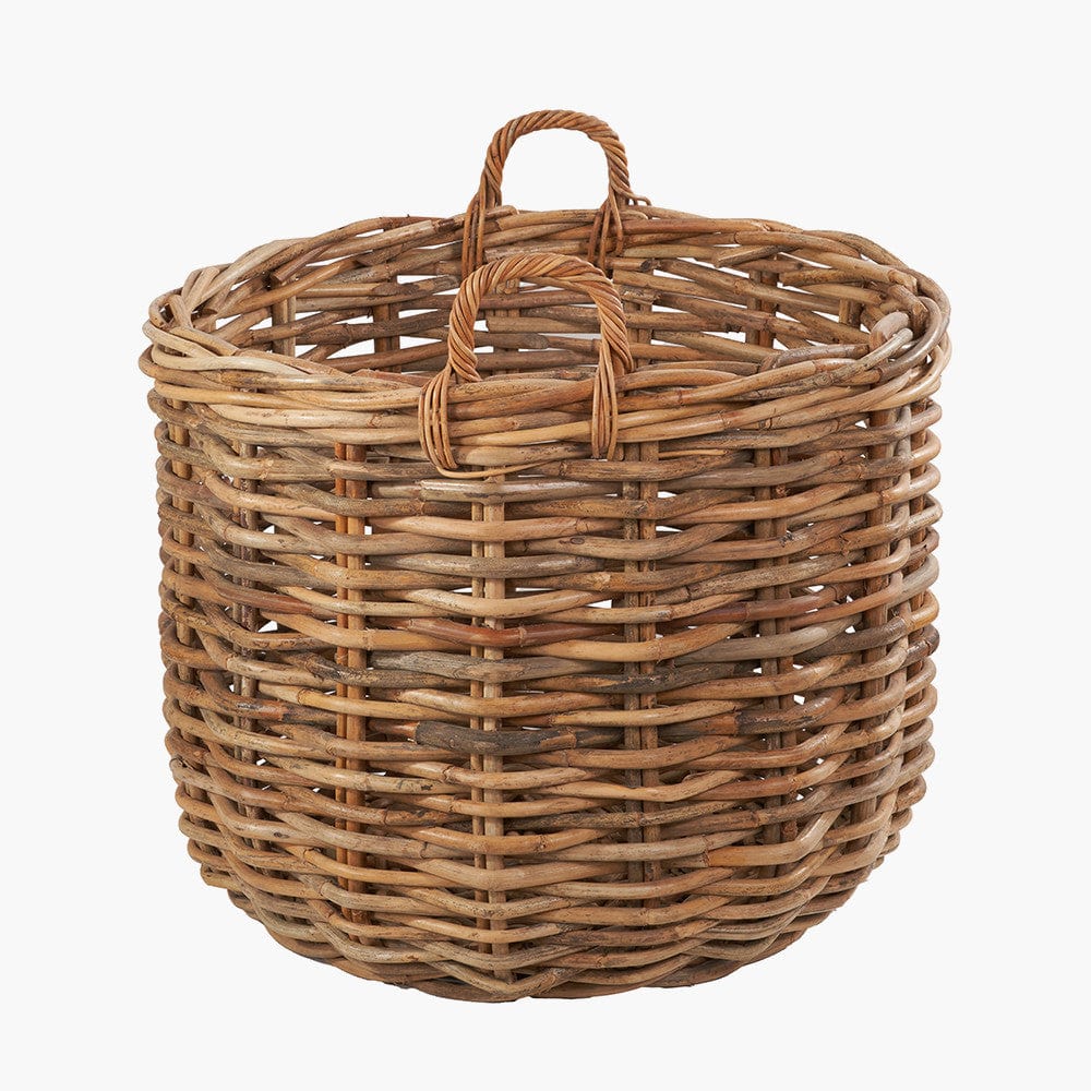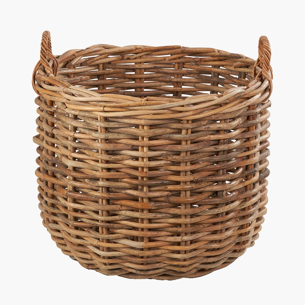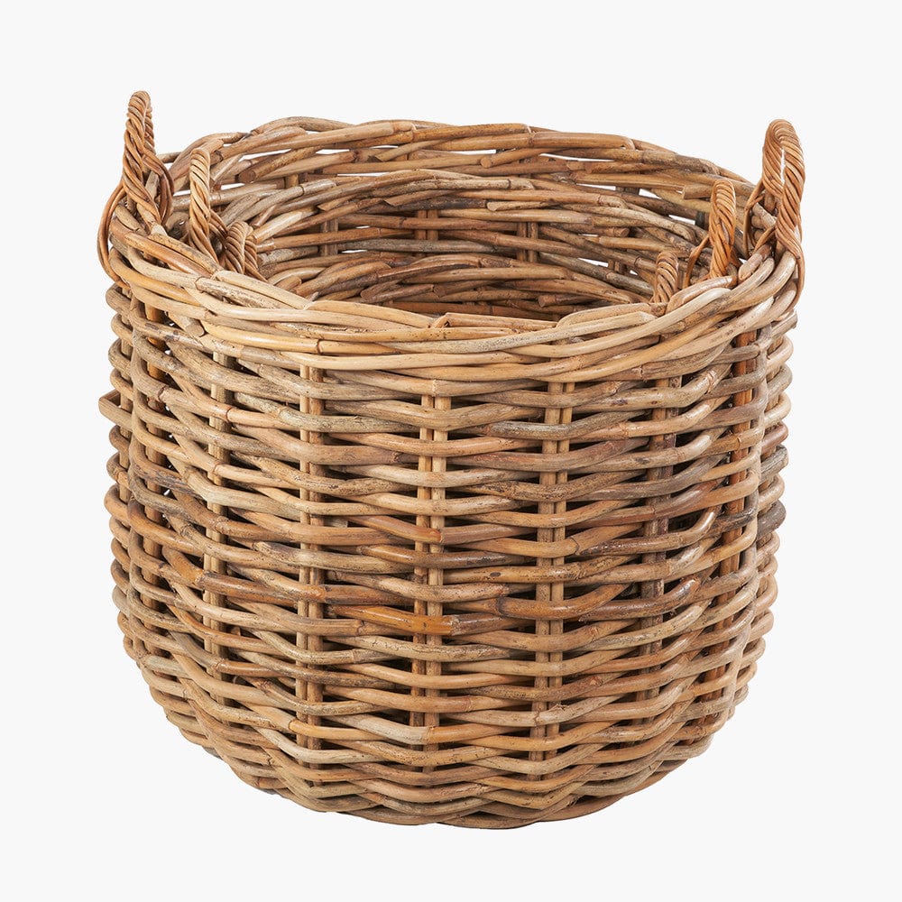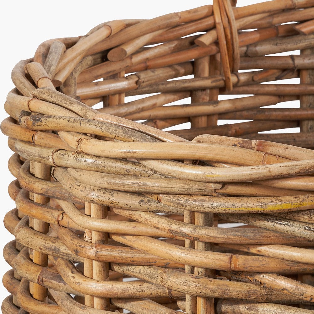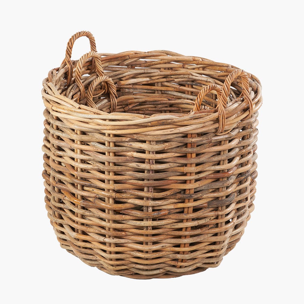 This set of 3, heavy gauge, chunky rattan log baskets, made in Indonesia, are perfect for storing multiple household items. Thec round baskets with handles are extremely versatile and ample size for storing logs next to your fireplace, blankets, magazines, or toys. The 3 baskets with ample proportions are suitable for indoor/outdoor use and are easily transportable with the handles and stack neatly inside each other when not in use. The natural colour of the rattan ensures the baskets will sit comfortably in any interior and will add a cosy, rustic charm to your home.