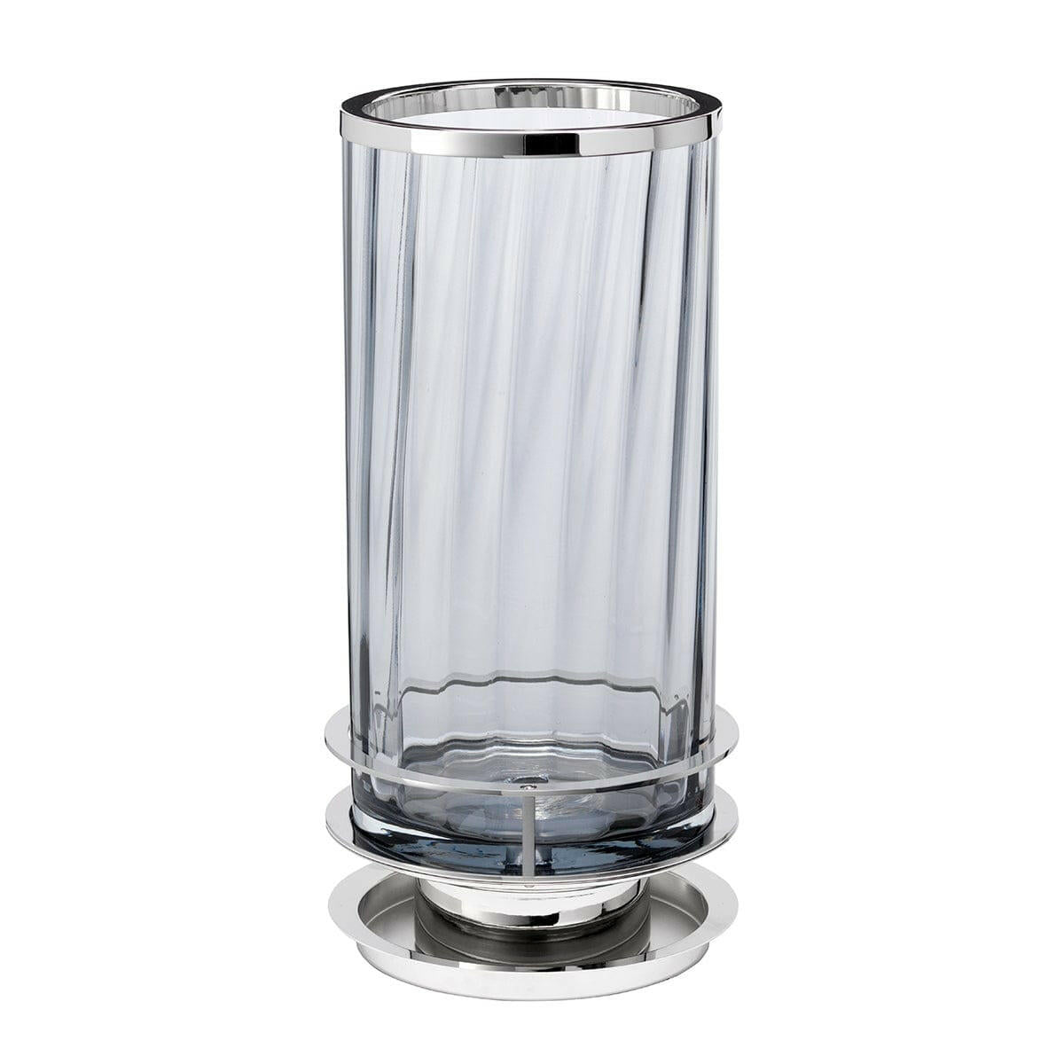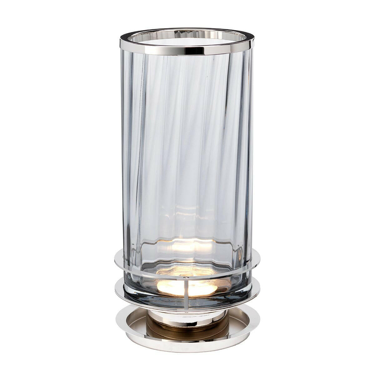 Blown glass obelisk table lamp with a prismatic texture and Smoked tint. The light source is cleverly hidden in the base with fine metal detailing in Polished Nickel.