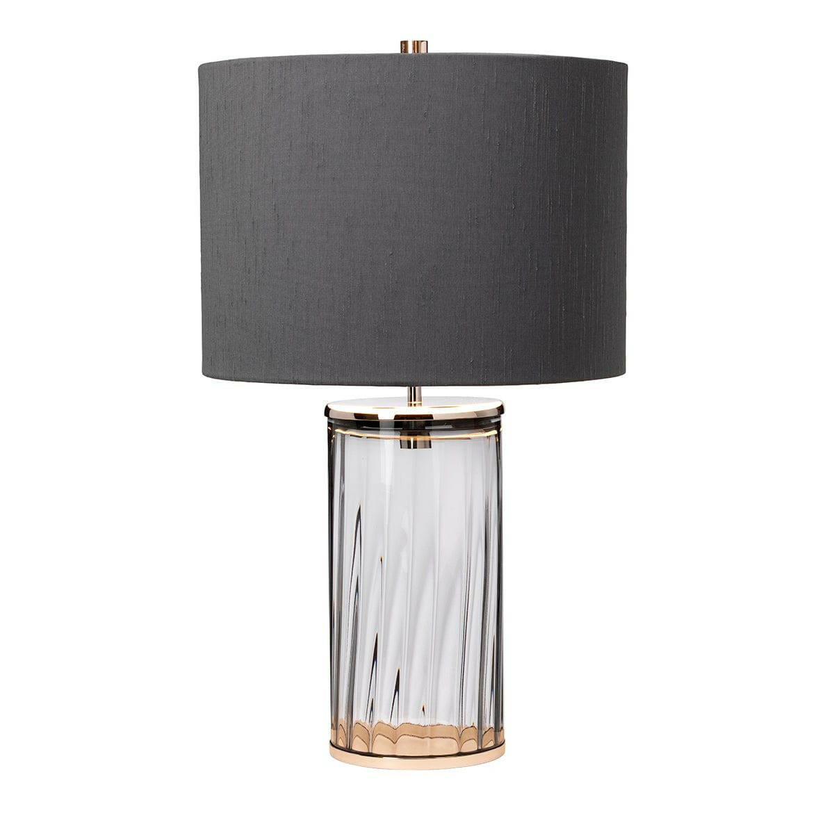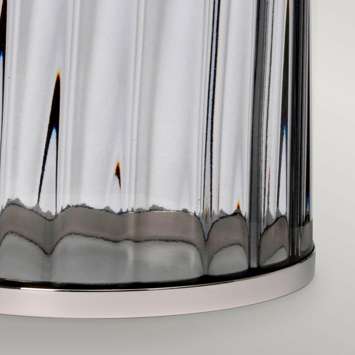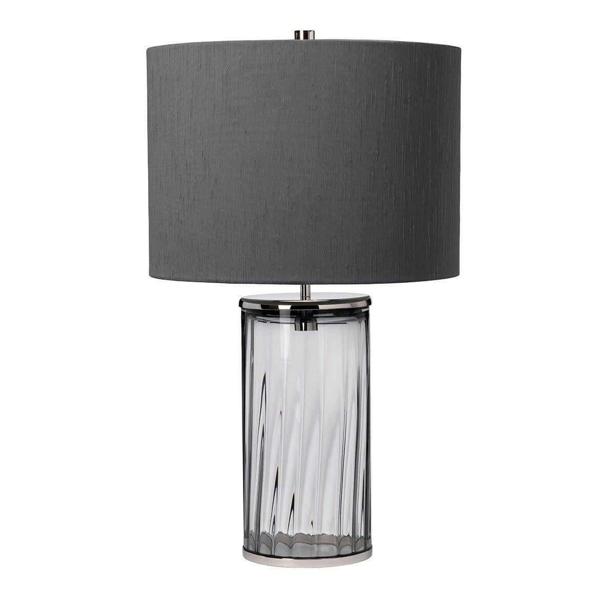 Blown glass table lamp with a prismatic texture and Smoked tint. Completed with crisp Polished Nickel details and a Whale grey faux silk shade with silver metallic inner.