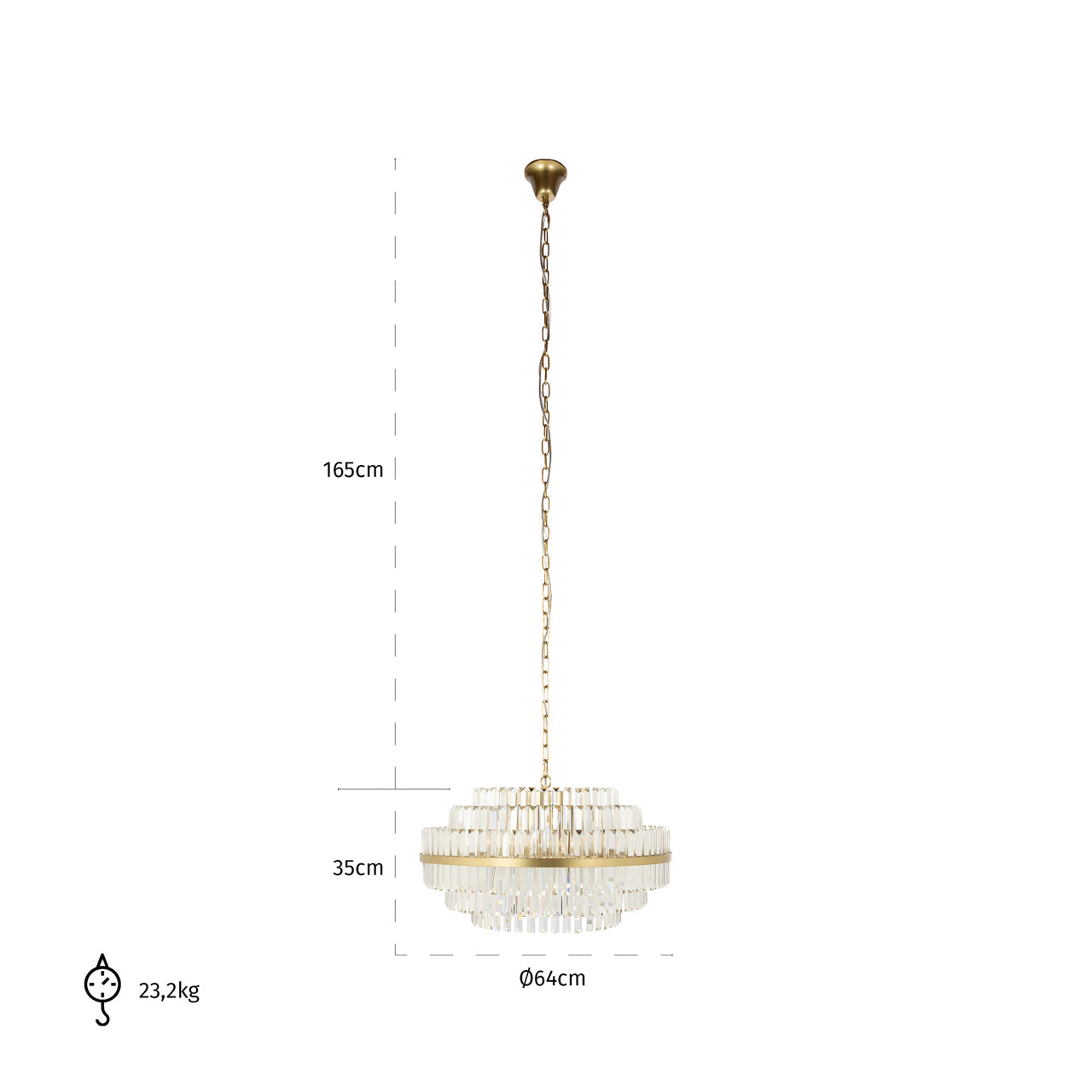 Pendant lamp Desire is the perfect addition to your interior! With its elegant design and golden details, this lamp adds a touch of glamour and luxury to any room. The numerous pendants give the lamp a classic look and create a beautiful play of light when the lamp is turned on. Pendant lamp Desire is available in a standard size, as well as in a smaller variant for those seeking a more subtle look.