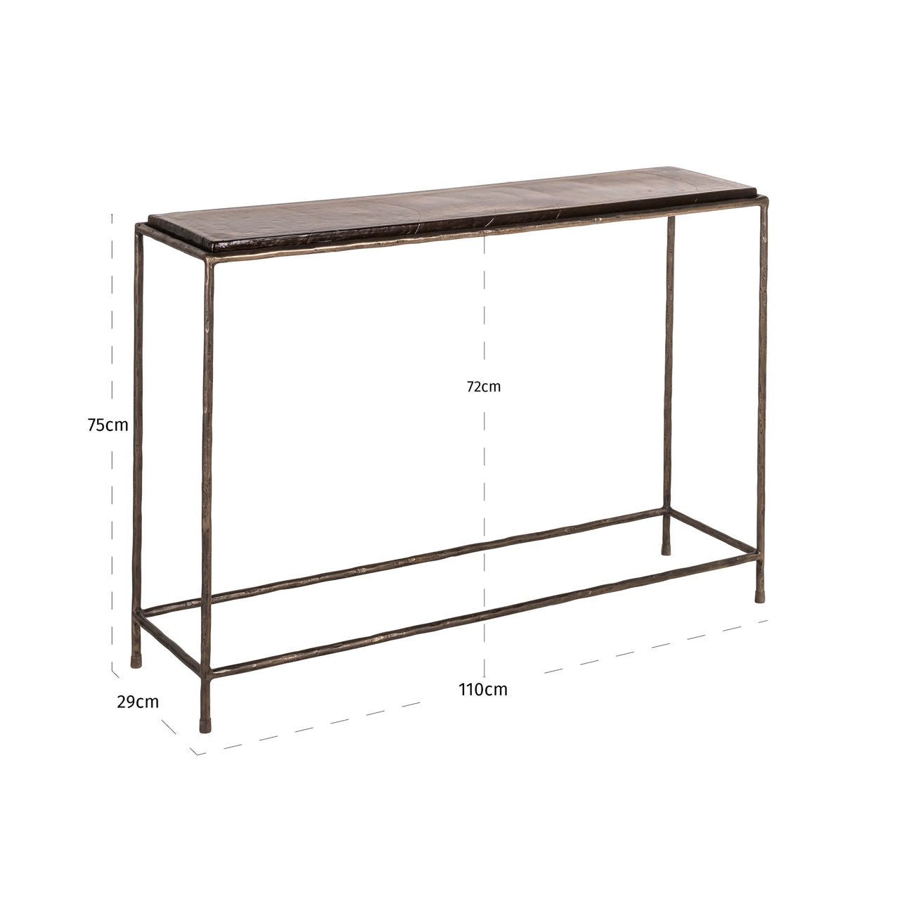 This console features an elongated shape with a slim and balanced silhouette. The bronze finish gives the piece a warm appearance. Its understated design makes it suitable for placement against a wall in various spaces.