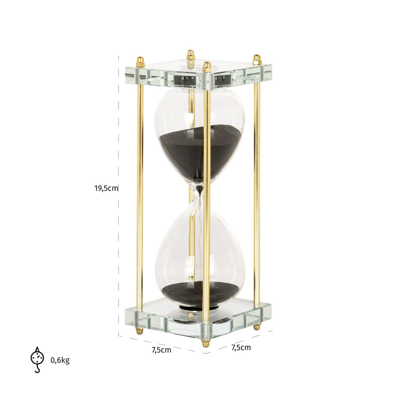 The hourglass Yolina combines the simplicity of glass with the refinement of golden details. The clear glass allows users to observe the sand moving in real-time, which can have a calming effect. The addition of golden details adds a touch of luxury and elegance, making it a beautiful decorative piece for any interior. Perfect for keeping track of time in a stylish manner or simply as an elegant decoration on a bookshelf or desk.
