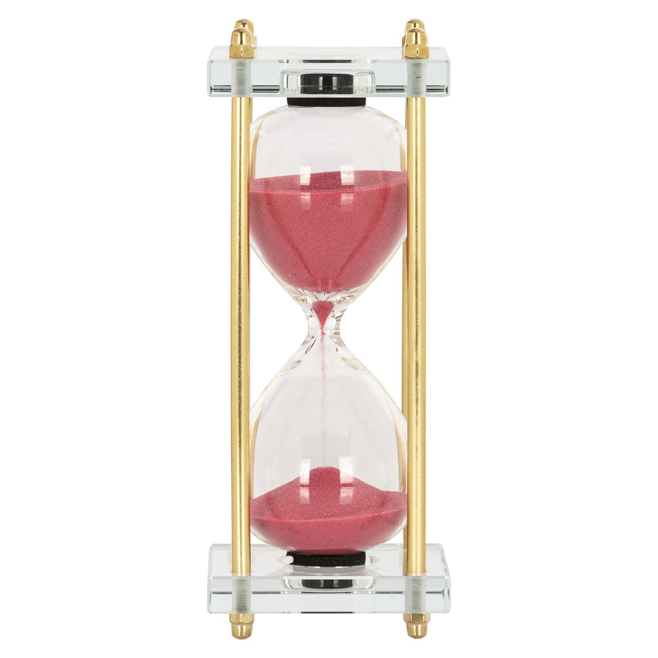 The hourglass Ziva combines the simplicity of glass with the refinement of golden details. The clear glass allows users to observe the sand moving in real-time, which can have a calming effect. The addition of golden details adds a touch of luxury and elegance, making it a beautiful decorative piece for any interior. Perfect for keeping track of time in a stylish manner or simply as an elegant decoration on a bookshelf or desk.