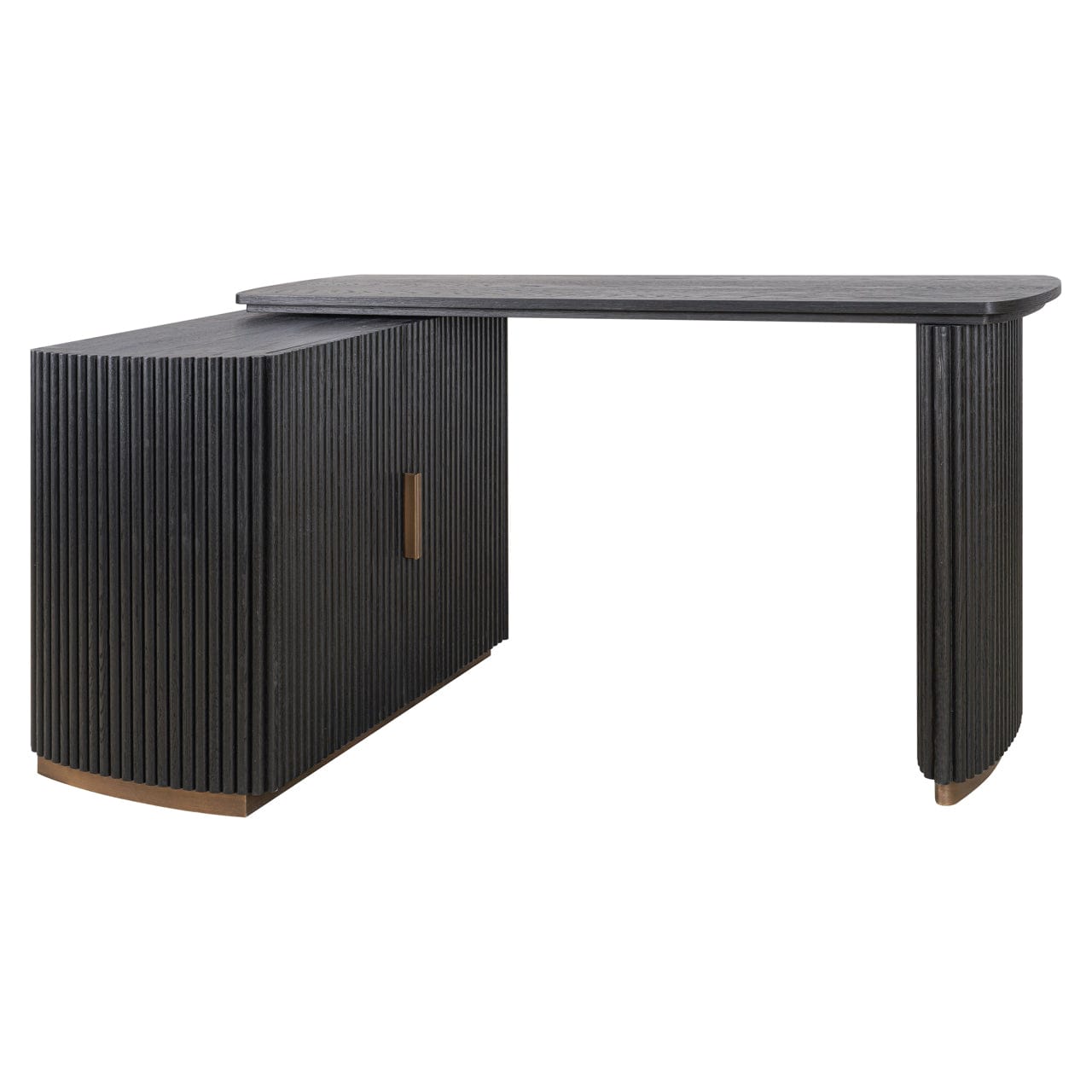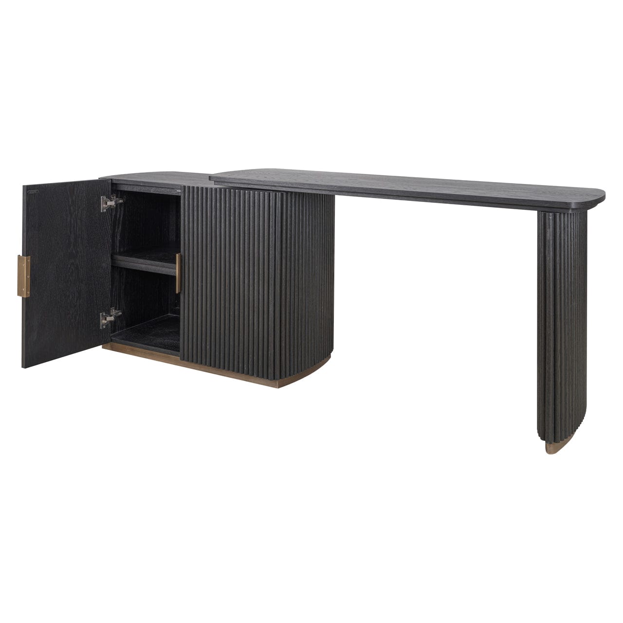 The Cambon desk combines functionality with a refined design. Made from dark wood with a subtle ribbed texture, this desk offers ample storage space behind its two doors. The tabletop is also rotatable, allowing you to easily adjust the layout to suit your working style. The brass accents add a modern touch, while the rounded corners create an elegant silhouette. This desk fits perfectly in both classic and contemporary interiors and is a stylish addition to your workspace.
