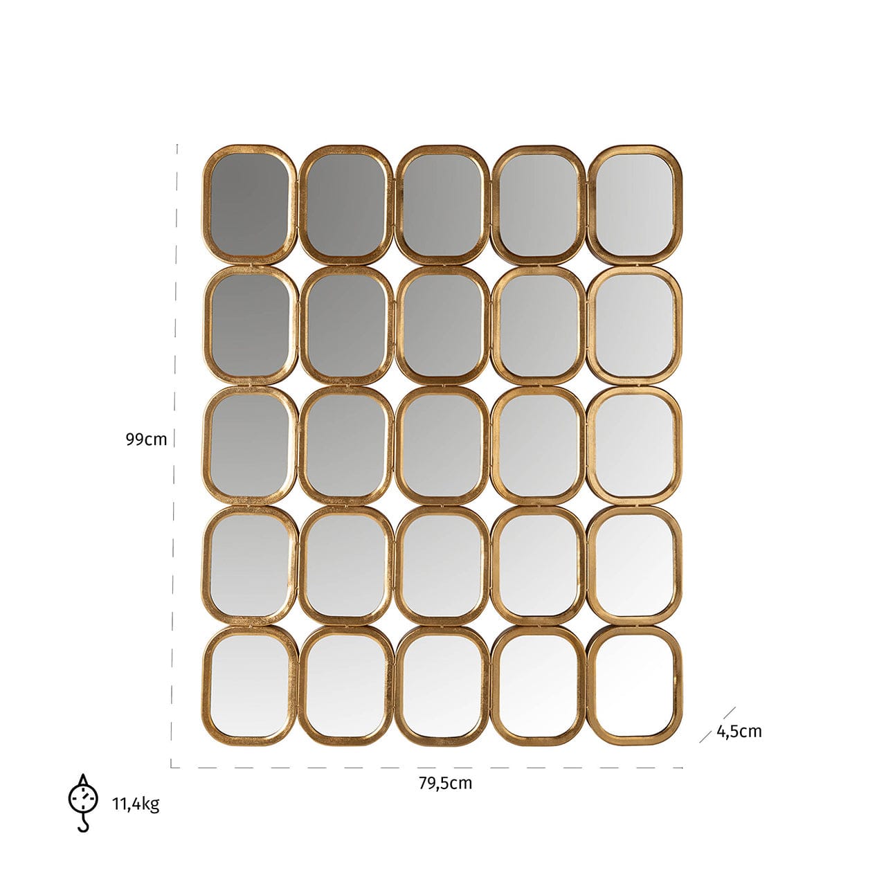 You can never have too many mirrors, and with mirror Marila, that is certainly not a problem. Mirrors are used for decoration and to add space and light to a room. Filling empty walls has never been easier. With its 25 separate mirrors, our Marila looks wonderful in the living room, hallway, bathroom or bedroom. Made of MDF and gold-coloured iron.