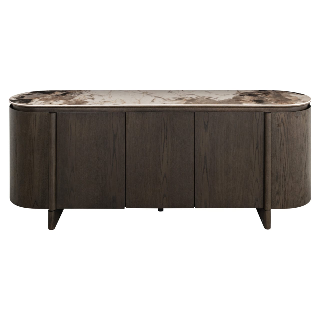 Sideboard Langford features vertical details in dark oak veneer and a sleek ceramic top. The rich brown tones and clean lines create a refined and timeless look.