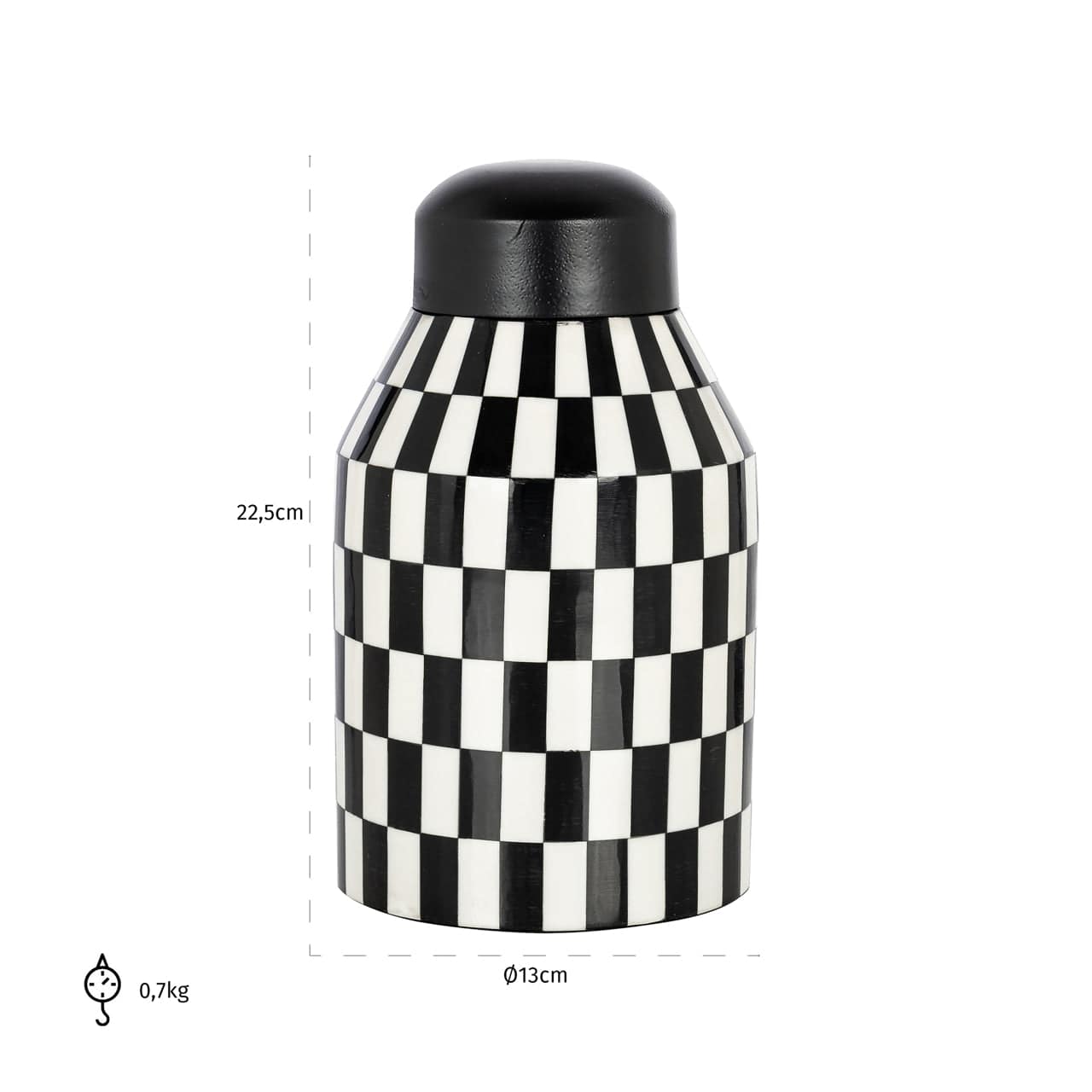 This unique pot immediately stands out with its black and white checkered design. The clean lines and the contrast between black and white provide a modern look, while the checkered pattern adds a touch of retro charm. Crafted with attention to detail, the Malou Pot is not only functional but also a real eye-catcher in any interior. Whether it's used to display a plant or simply as a decorative object in its own right, this pot immediately adds character and style to any space. Available in both small and large sizes, the Malou Pot offers versatility and adaptability to various decor needs. It's the perfect blend of functionality and aesthetics.