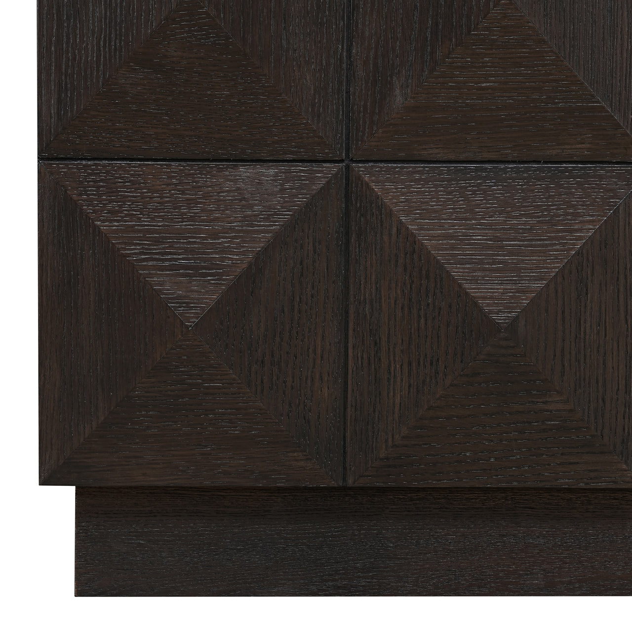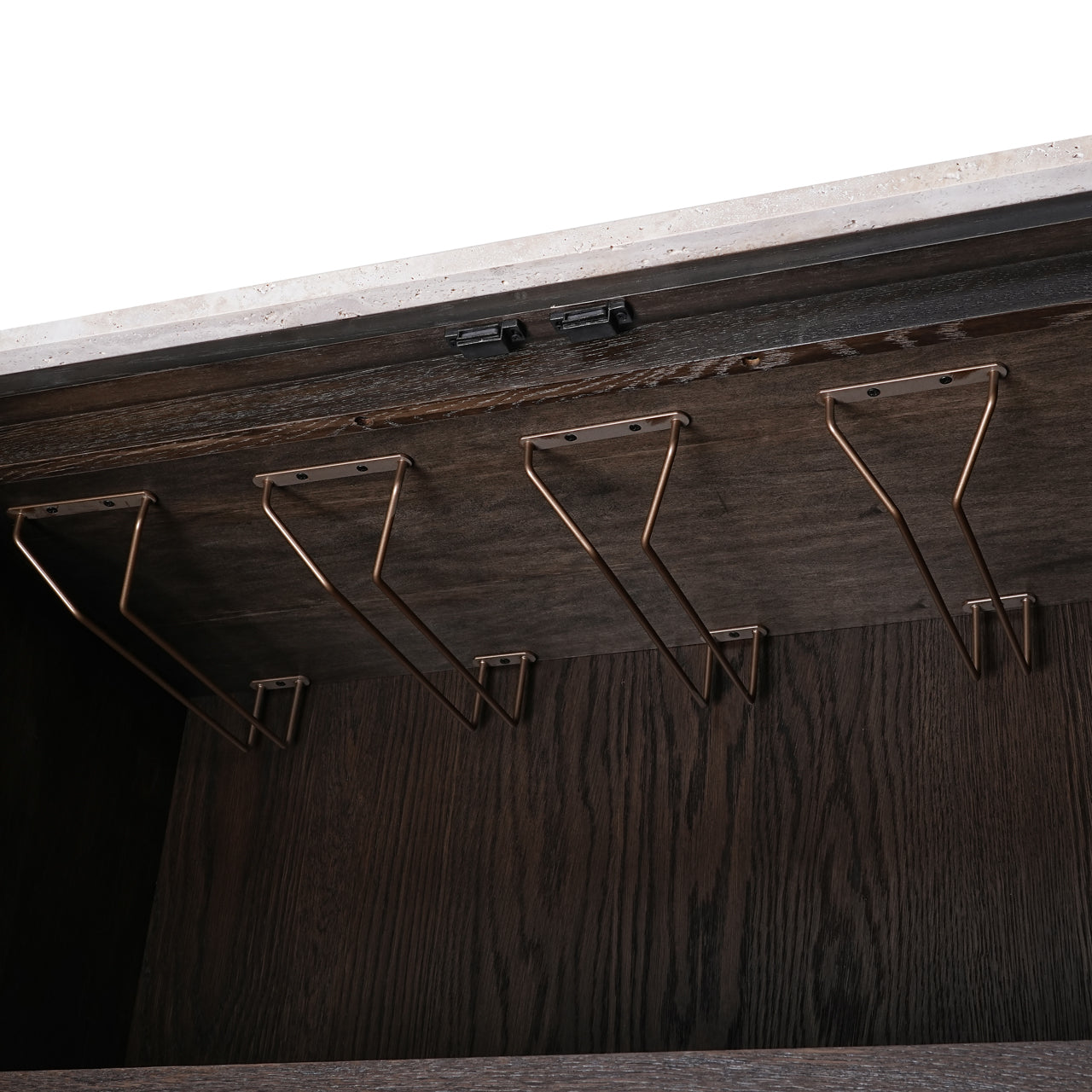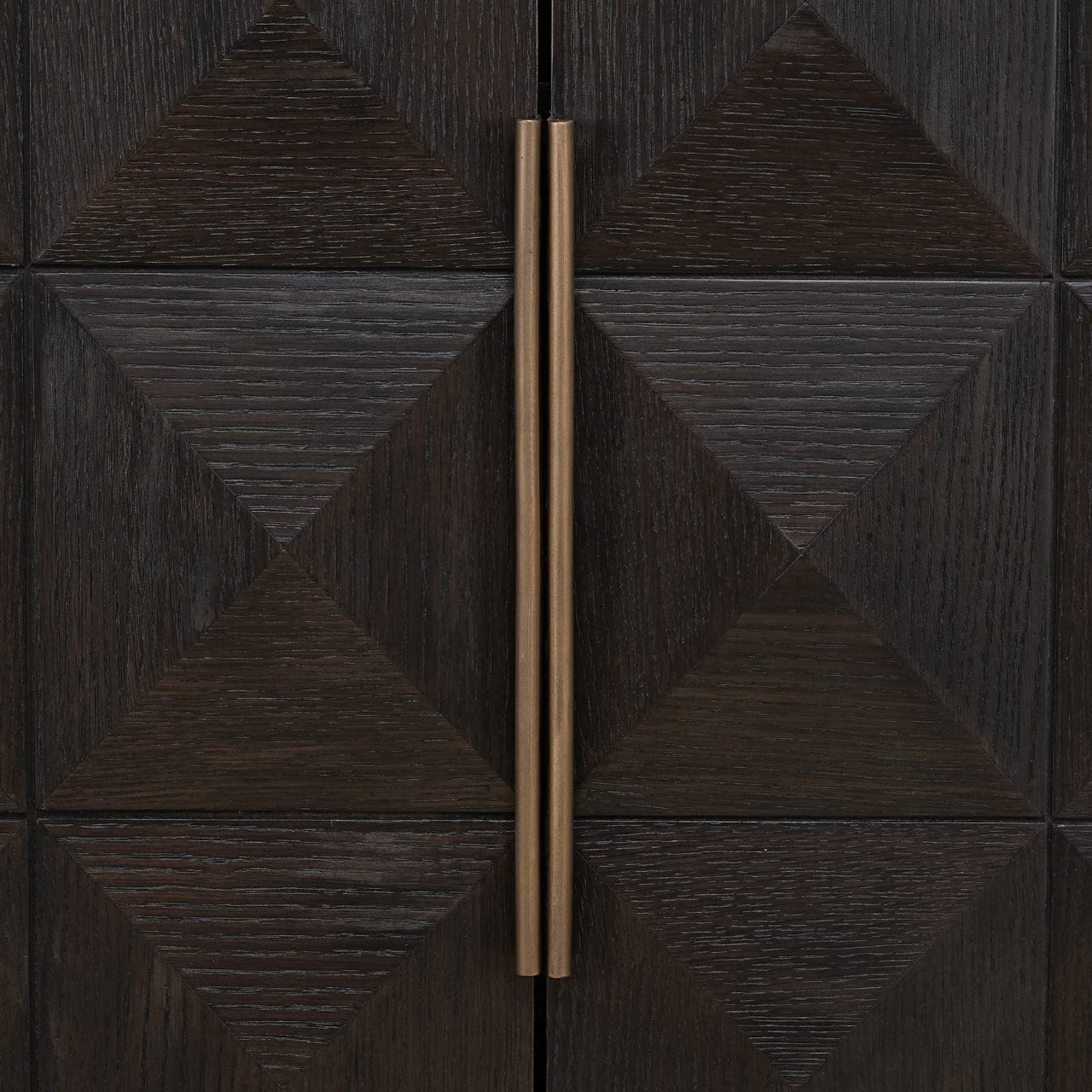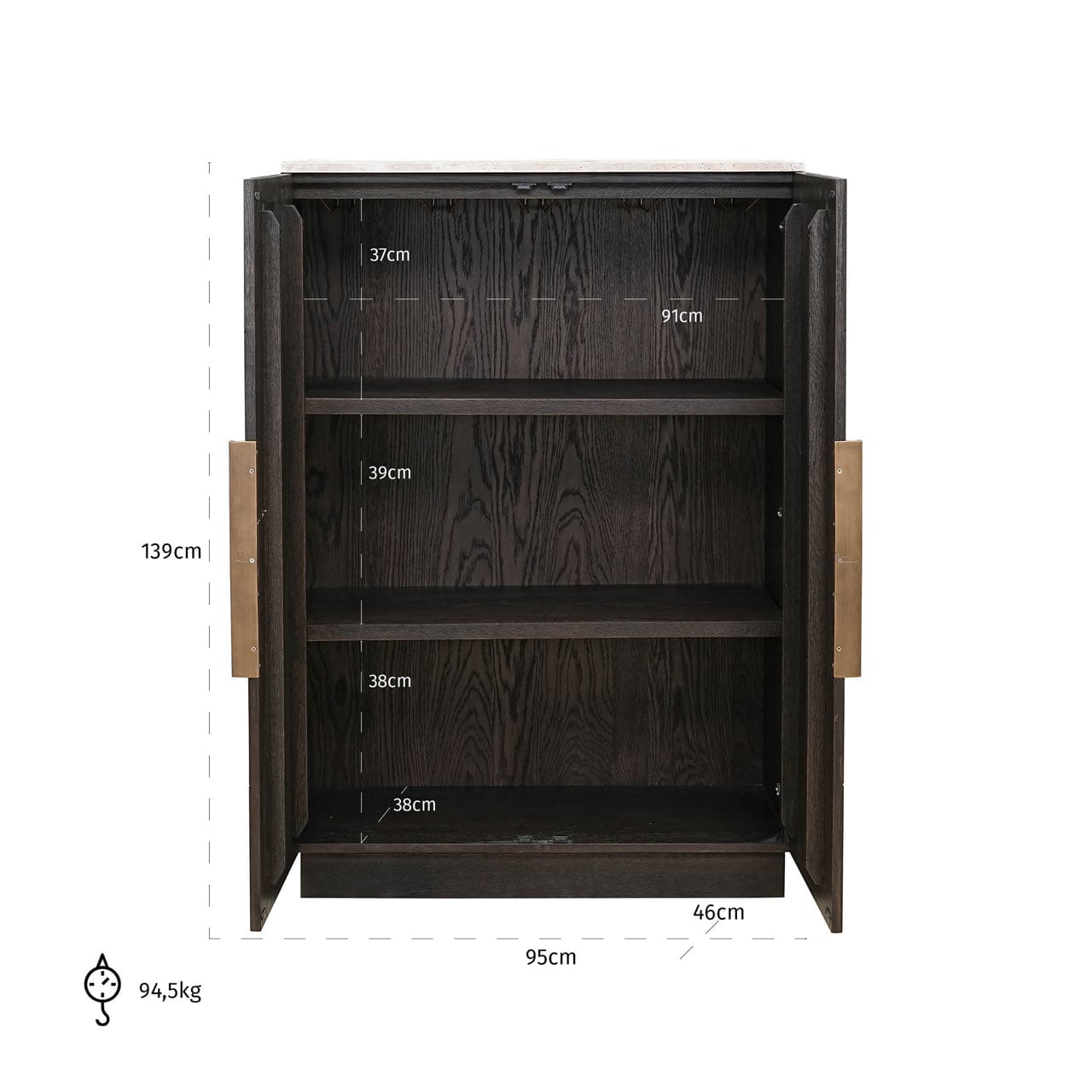 The Claremont cabinet is crafted from oak veneer, oak wood, travertine and wood, offering a robust and elegant appearance. The cabinet has two doors with a striking geometric pattern, giving the design a modern and stylish touch. The stone top adds a luxurious element, while the solid construction ensures durability. This cabinet provides ample storage space and is a functional and aesthetically pleasing piece for various interior styles.