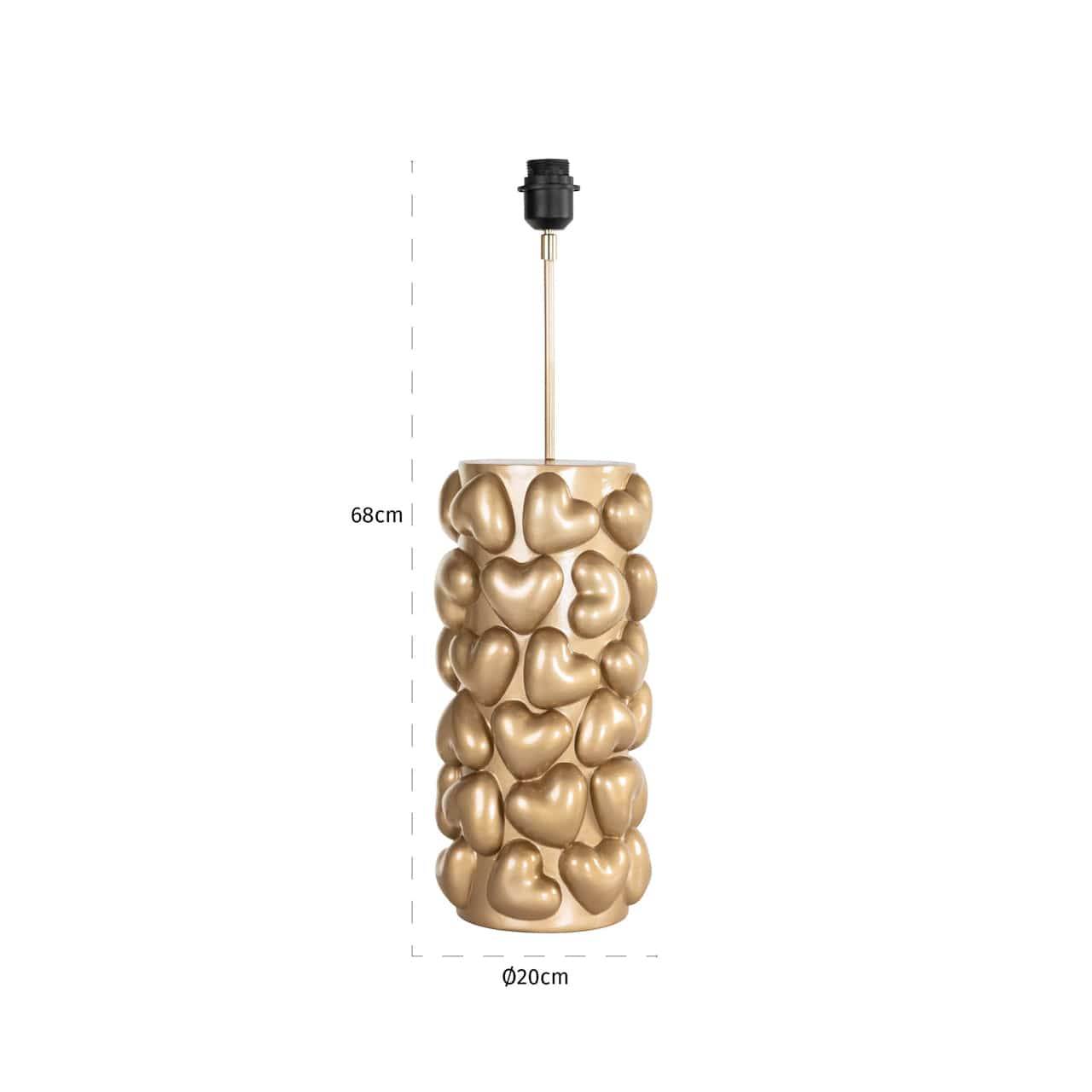 The Nancy Hearts table lamp is a playful and unique addition to your interior. With a base adorned with a pattern of subtle heart shapes, this lamp radiates a warm and friendly atmosphere. The golden finish gives Nancy Hearts a touch of elegance, while the design retains a charming and airy character. This lamp is ideal for a nightstand, side table, or dresser, where it not only provides light but also adds a cheerful accent to the space. Nancy Hearts is perfect for those looking for a lamp with a distinctive look that feels both stylish and personal.