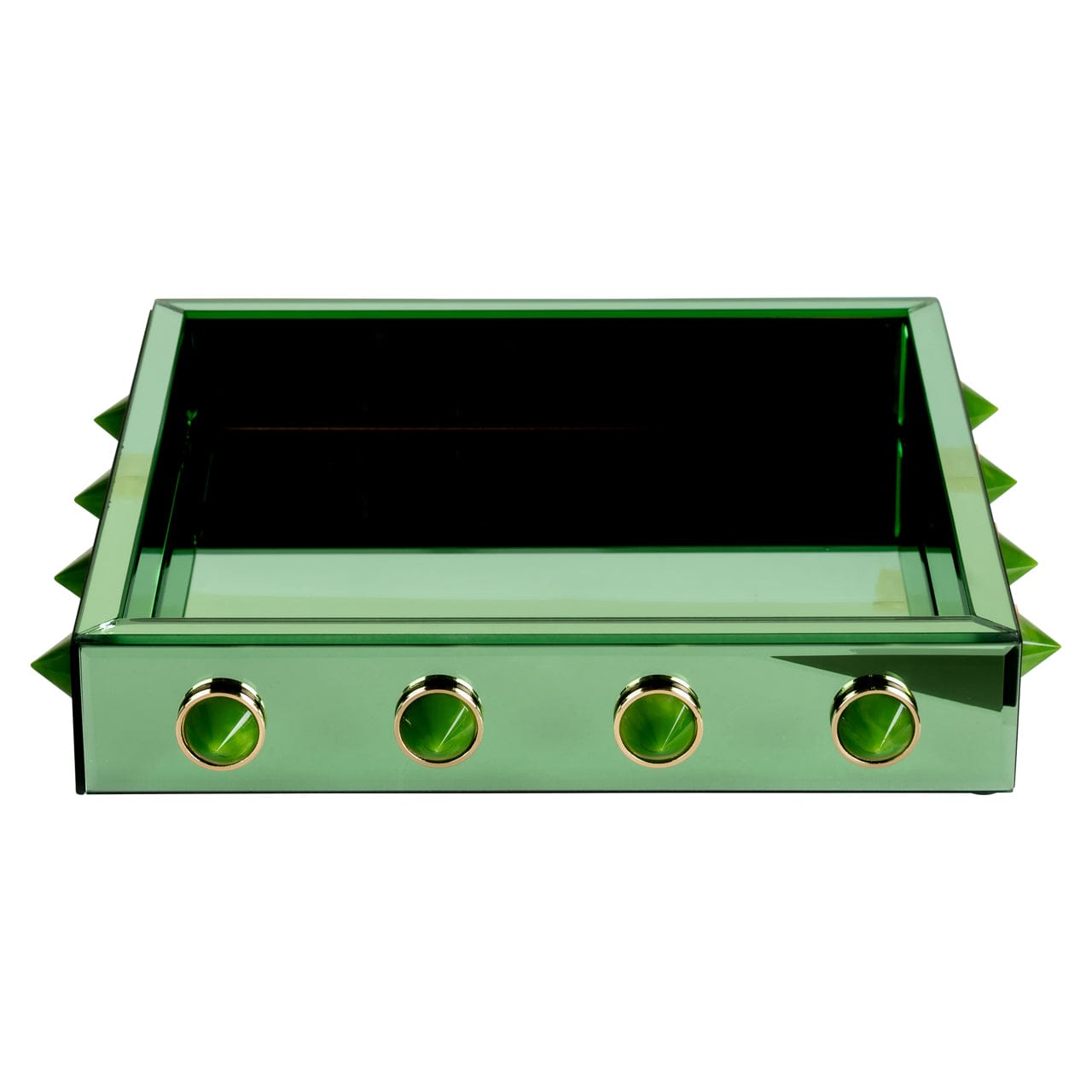 Tray Jinx in green is a stylish and striking accessory that exudes luxury and modernity. The glossy green surface, combined with subtle gold accents, gives this tray a chic and refined look. The geometric details on the sides add a contemporary and bold element, making Jinx both functional and decorative. Perfect for serving drinks or snacks, or displaying decorative items. With tray Jinx, you add a touch of glamour to any space.