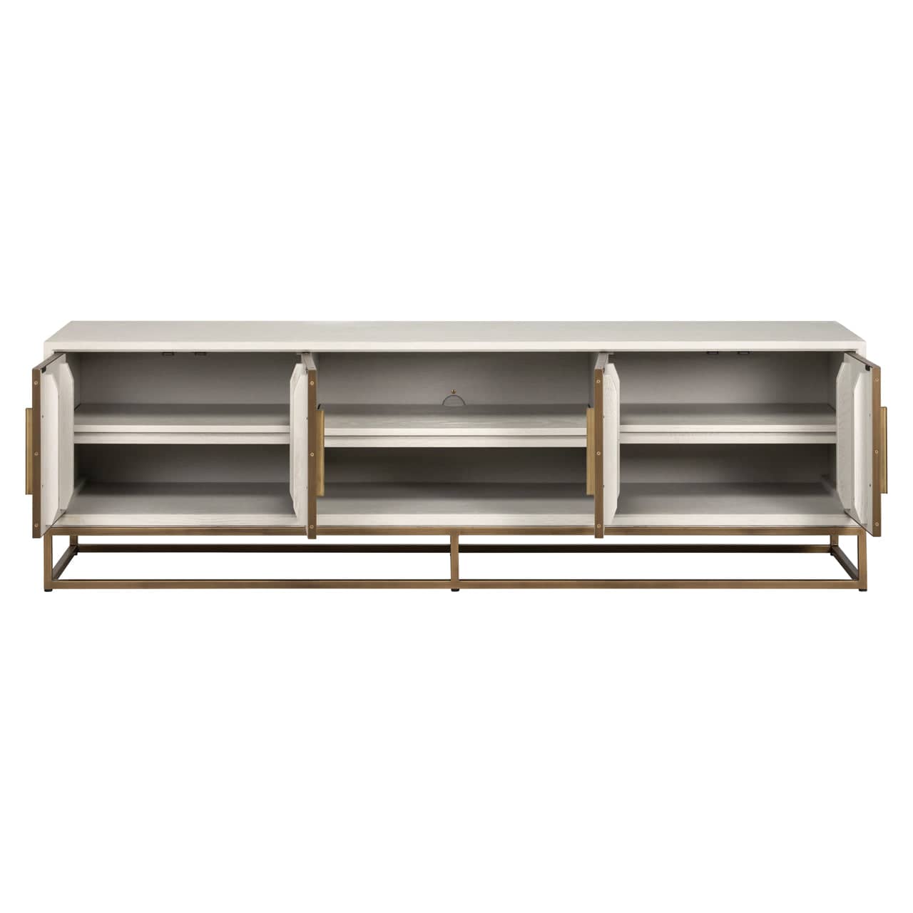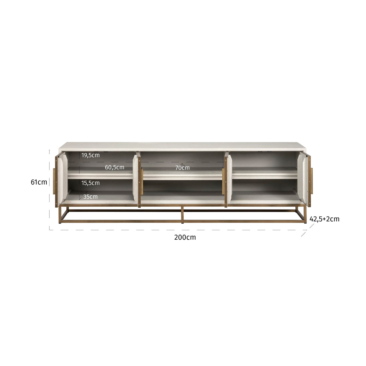 A combination of Oak Veneer and copper-colored metal comes together in this stylish TV cabinet from the Whitebone Brass collection. The whitebone finish of the Oak Veneer, combined with copper-colored metal accents, creates a luxurious look. With four doors and a width of 200 cm, this piece of furniture provides ample storage space for all your entertainment needs.