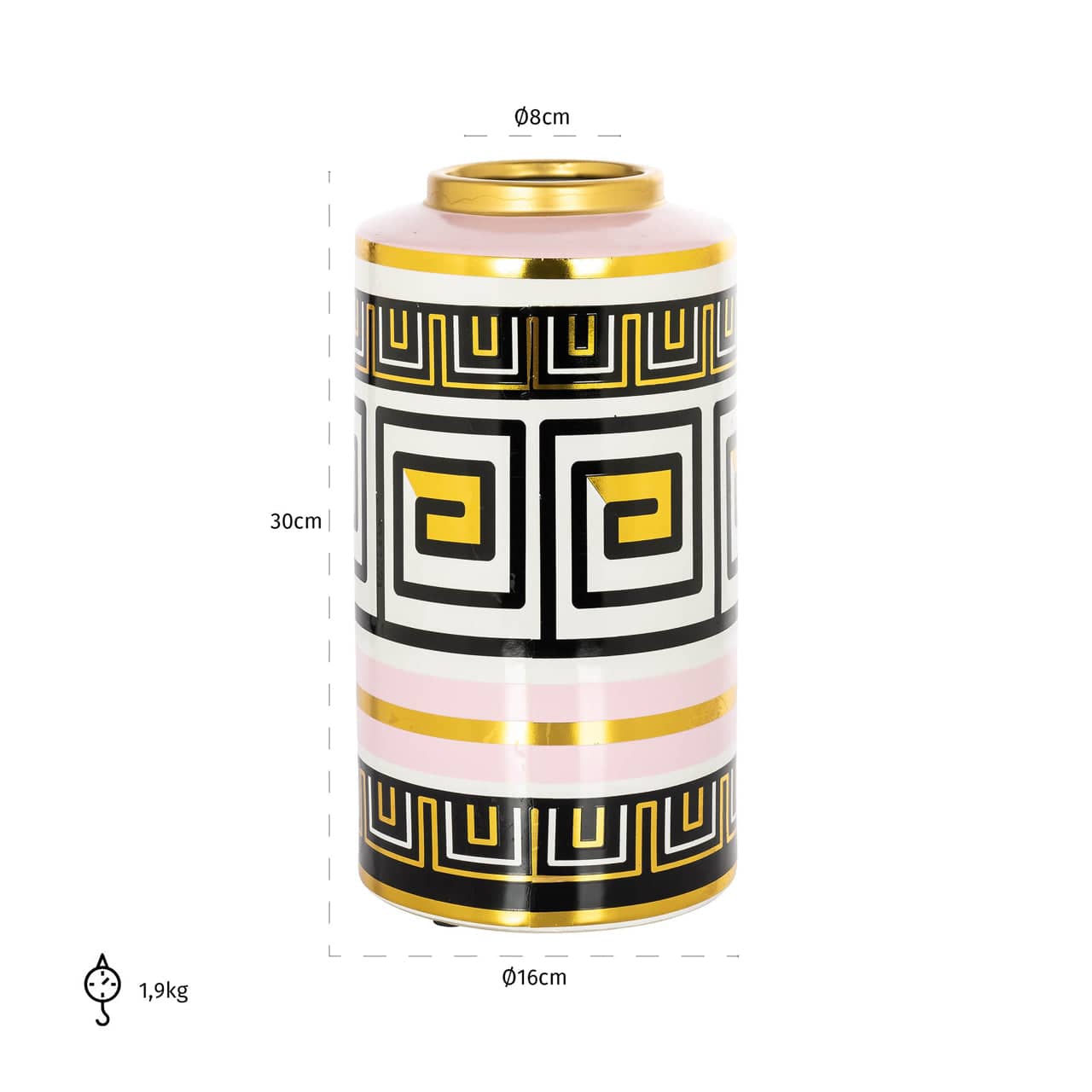 The Vase Leora, a beautiful decorative piece available in both large and small sizes, distinguishes itself with a colorful design enriched with pink and gold accents. This vase elegantly combines vibrant colors, making it a striking and cheerful addition to any interior. The small variant is ideal for adding a colorful accent to compact spaces or as a delicate decoration on tables and shelves. The larger size of the Leora vase makes a powerful statement and is perfect for displaying larger flower arrangements or as a central art piece in your living or workspace.