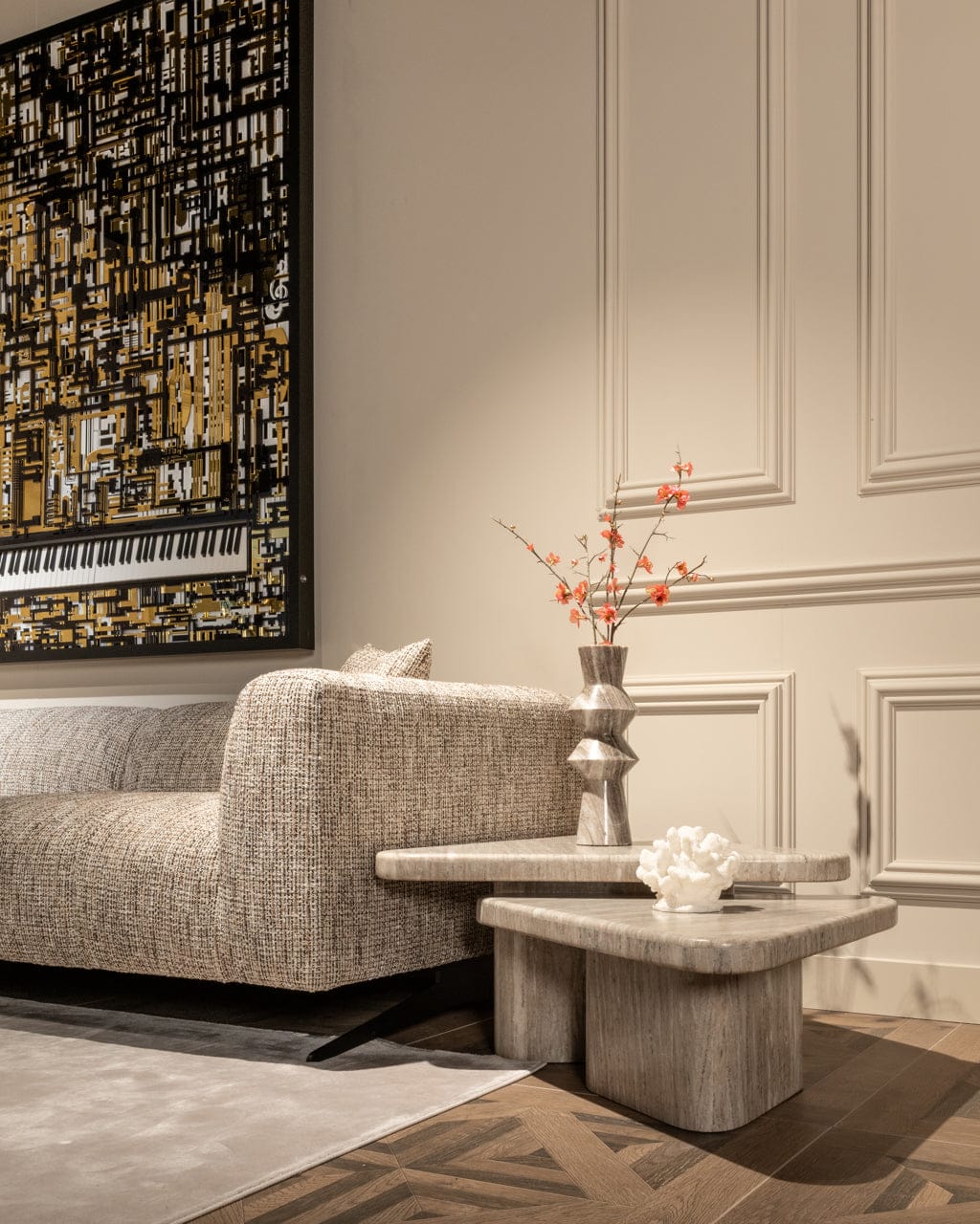Vase Siem is a stunning decorative piece that exudes luxury and sophistication with its marble-like finish and bold geometric shapes. The subtle beige tones and unique contours give this vase a modern and artistic appearance, making it perfect for showcasing on its own or with a floral arrangement. Vase Siem is a standout accessory that adds a touch of elegance and character to any interior, ideal for placement on a side table, sideboard, or in the hallway.