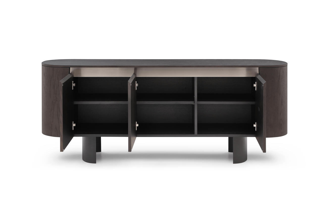 Elevate your space with the refined elegance of the Salvo Buffet, a perfect fusion of modern sophistication and natural warmth. Crafted in rich Smoke Oak, its deep, textured grain exudes organic beauty, while the sleek stainless steel detailing adds a contemporary edge. Resting on sturdy black powder-coated legs, this statement piece balances strength and style, creating a timeless aesthetic that complements both minimalist and luxurious interiors.