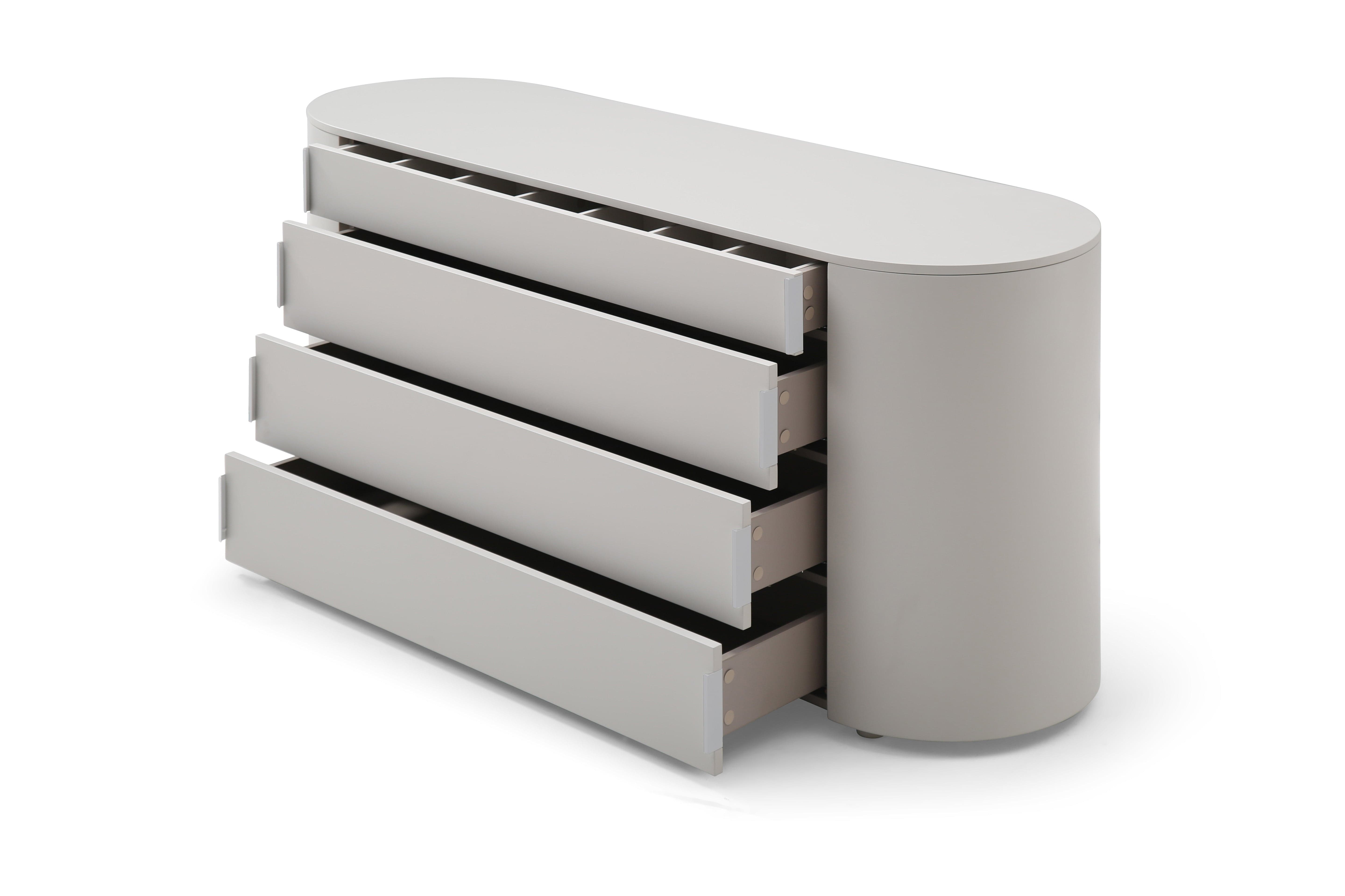 The Sims Dresser brings a refined touch of contemporary elegance to any bedroom with its chic design and understated charm. Its gently curved silhouette and elongated oval form create a sophisticated focal point, while the matte beige finish lends a modern, versatile appeal. Thoughtfully designed for both style and function, it offers top compartments for easy organisation alongside four spacious drawers for ample storage. Subtle matching beige handles complete the look, ensuring a seamless blend of practicality and sleek aesthetics.