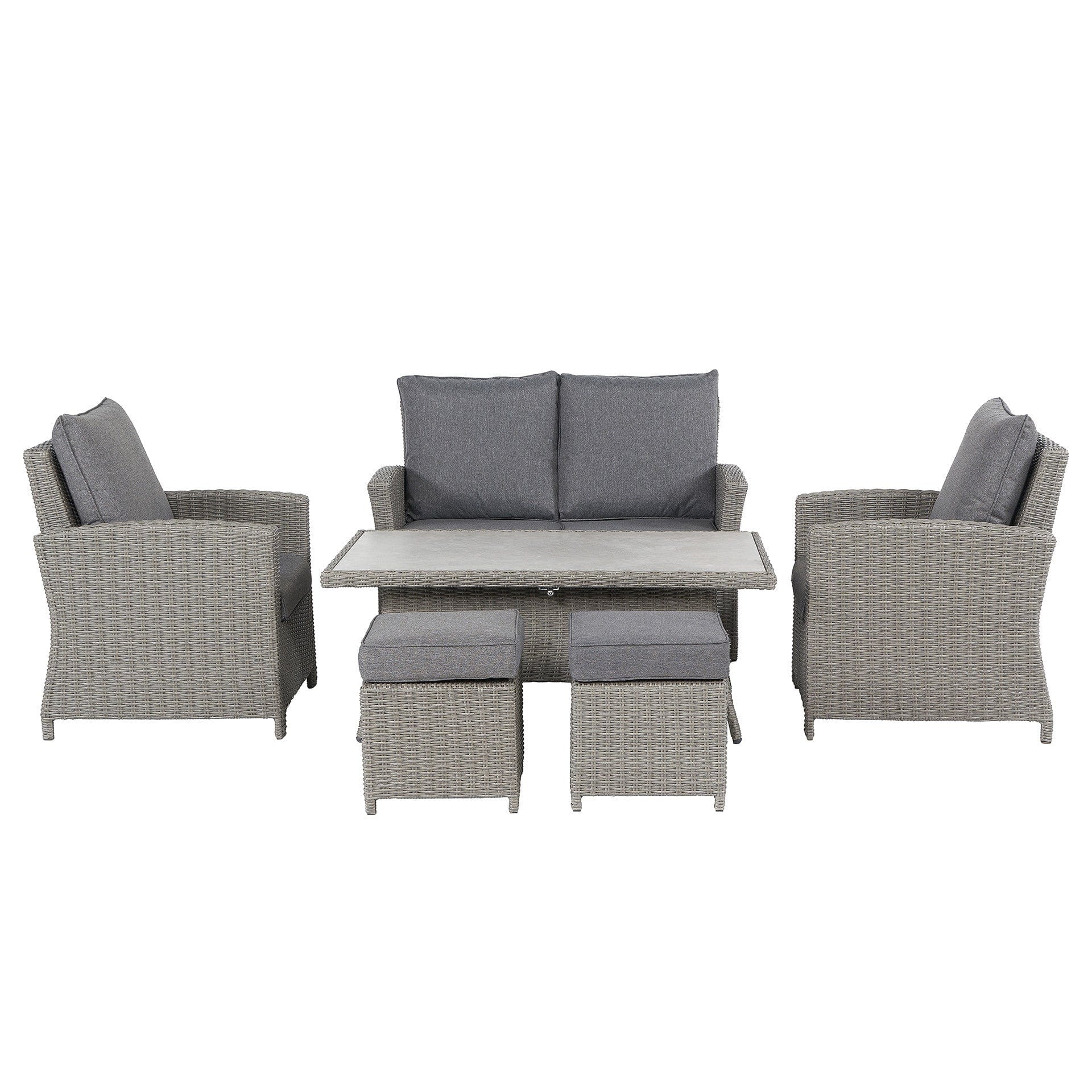 The Slate Grey Barbados 2 Seater Lounge Set with Ceramic Top from House of Isabella is the perfect combination of functionality and style. This set includes a 2 seater sofa, 2 armchairs, and 2 footstools, all surrounding an adjustable rectangular dining table. With a simple gas pump mechanism, the table can easily be adjusted to a lower coffee style or a higher dining table. Made with a powder-coated aluminium frame and a synthetic half round rattan weave in a sleek slate grey tone, this set is not only durable and weatherproof, but also UV protected for virtually maintenance-free use. The beautiful ceramic tabletop adds a touch of elegance to the design. All cushions are season proof and fire retardant, ensuring the highest quality in every detail. Plus, with fast and free delivery in the UK, you can enjoy this luxurious furniture set in no time. Order now and add the optional cover for even more protection with code 18-C-7916.