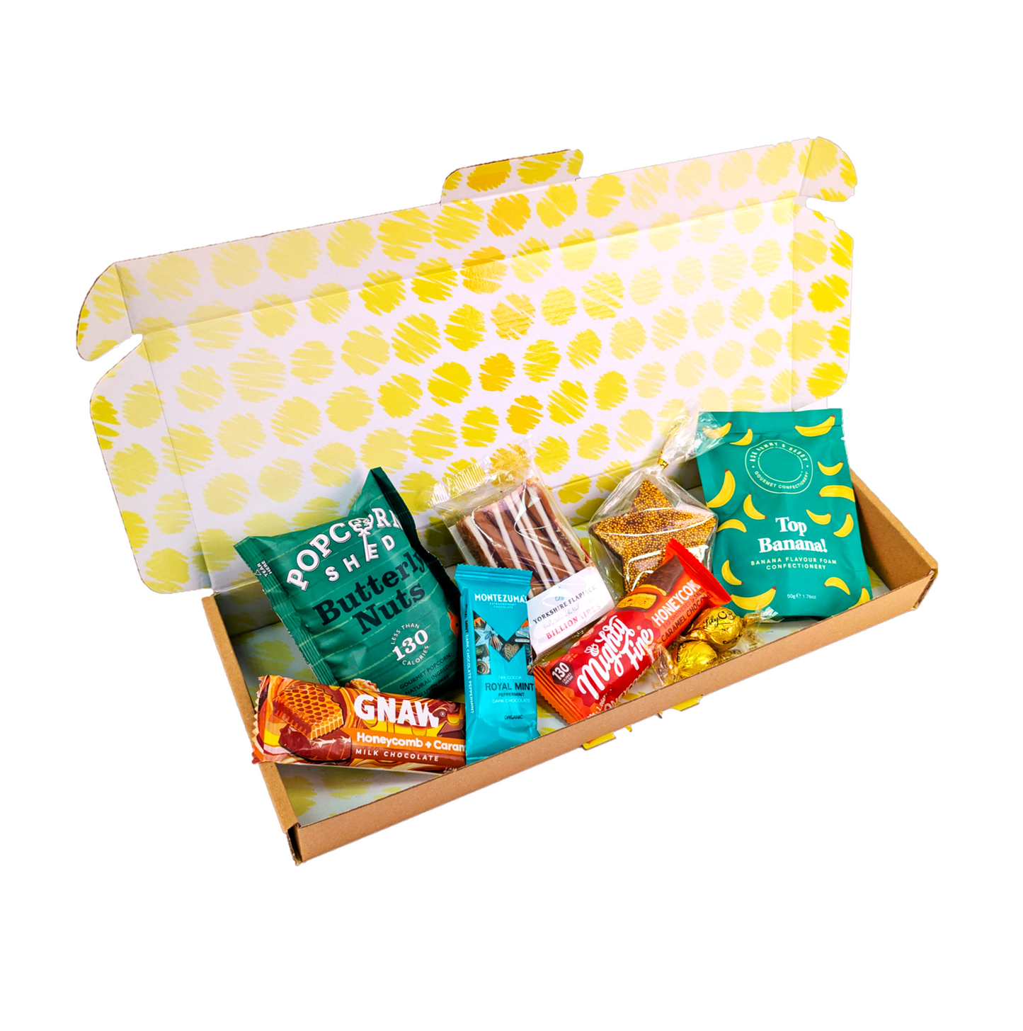 About Penny Post Just Because Sometimes the best gifts don’t need a reason – the Just Because Letterbox Hamper is a sweet surprise for when you simply want to brighten someone’s day. Filled with a playful mix of chocolate, flapjack, popcorn, and gummies, it’s a thoughtful way to say “thinking of you” in the most delicious fashion. Inside, there are fun Ask Mummy & Daddy Top Banana Gummies , a rich Yorkshire Billionaires Flapjack , and the golden crunch of a Mighty Fine Salted Caramel Honeycomb Bar . Chocolate lovers will enjoy the smoothness of a Gnaw Honeycomb & Caramel Chocolate Bar , alongside silky Lily O’Brien’s Salted Caramel Chocolates . Adding even more indulgence, you’ll find buttery Popcorn Shed Butterscotch Popcorn , a Thornton & France Milk Chocolate Star , and the refreshing snap of a Montezuma Royal Mint Peppermint Dark Chocolate Bar . ✔ A cheerful mix of sweet treats & chocolate ✔ Letterbox-friendly delivery ✔ Perfect for thank you, thinking of you & “just because” gifts No occasion needed – just a delicious little gesture to make their day! Our Penny Post is shipped free of charge with Royal Mail 1st Class. Please note: Our Penny Post range are sent on an untracked 24hr service. This is a free delivery service and parcels usually take 1–2 days to arrive. While you may select a date at the point of order, this date is not guaranteed under this service. Penny Post Just Because Contains Ask Mummy & Daddy Top Banana Gummies 50g x1