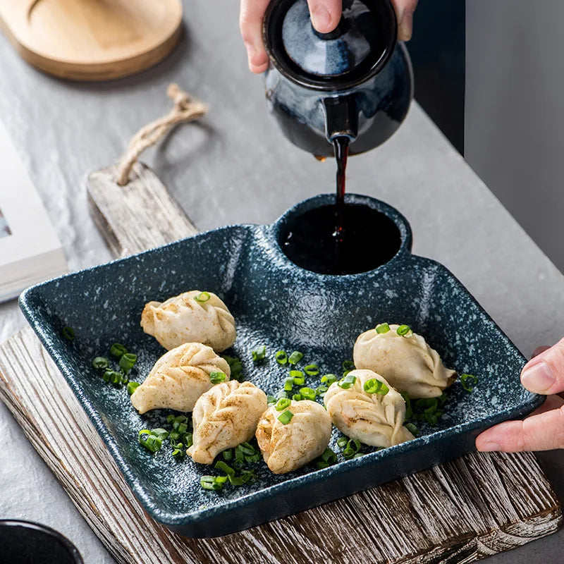 Experience culinary elegance with the Sutekina Plate Collection, where functionality meets sophistication. Crafted with a unique compartment design, these plates are perfect for serving dumplings, sushi, or any appetiser with a dipping sauce. Their textured, matte glaze in deep indigo and slate tones adds an artistic touch to any table setting, while the integrated sauce reservoir means every bite is paired with your favourite flavours. Perfect for both intimate dinners and stylish social gatherings, the Sutekina Plates turn every meal into a gourmet presentation.