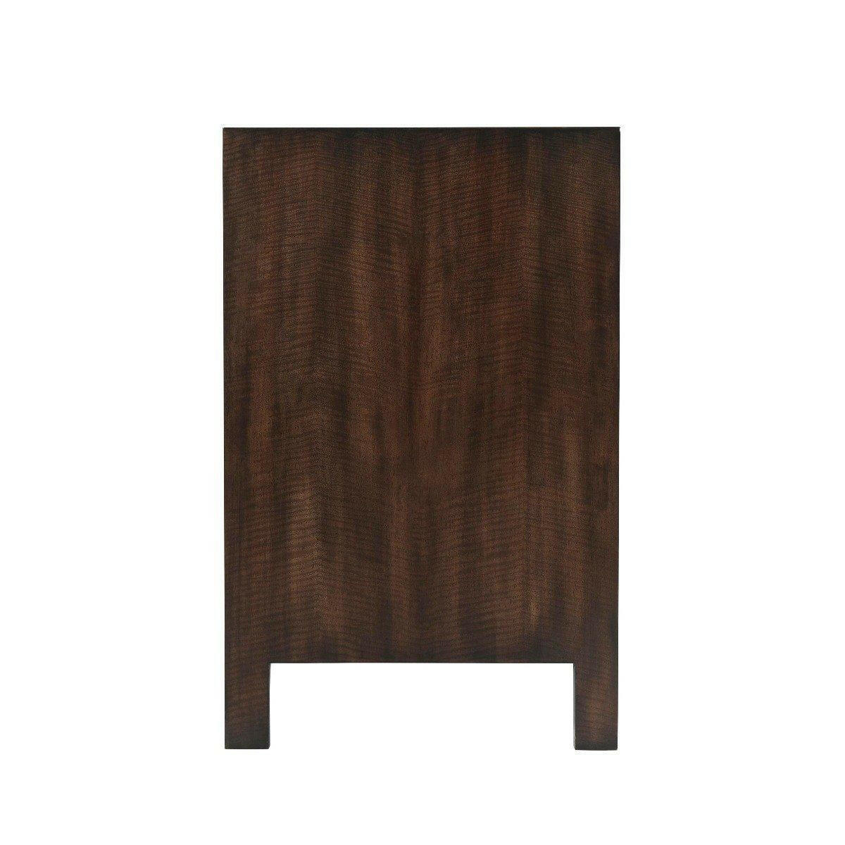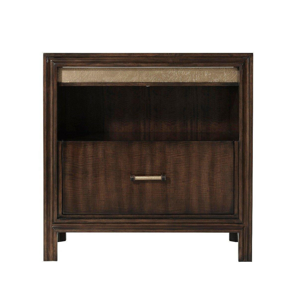 The Bedside Table London is a stunning addition to any bedroom. Made with a figured Anagre veneer and etched brass, this nightstand exudes luxury and elegance. The rectangular top is perfect for holding a lamp or other bedside essentials, while the recessed illuminated etched brass frieze panel adds a touch of sophistication. The open shelf and deep self closing drawer provide ample storage space, and the etched brass and wooden baton handle adds a unique touch. This bedside table measures 76.2 x 48.3 x 76.2, making it the perfect size for any room. Shop now at House of Isabella for luxurious furniture and enjoy free UK delivery.