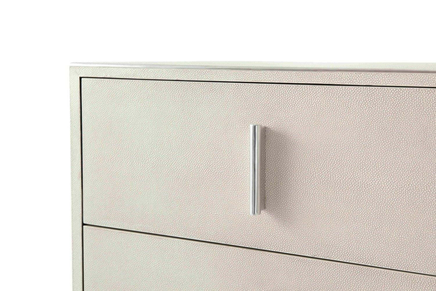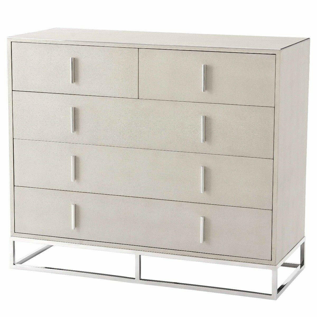 Ta Studio Chest of Drawers Blain in Overcast is a luxurious addition to any bedroom or dressing room. With two short and three long drawers, this modern chest provides ample storage space for all sizes of belongings. The light Overcast tone of the shagreen-embossed leather inlay adds a subtle touch to the overall design. The polished nickel finish on the base, moulding, and handles adds a sleek and sophisticated touch. Hand polished metallic details and an open cube base give this five-drawer chest a contemporary and delicate style.