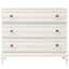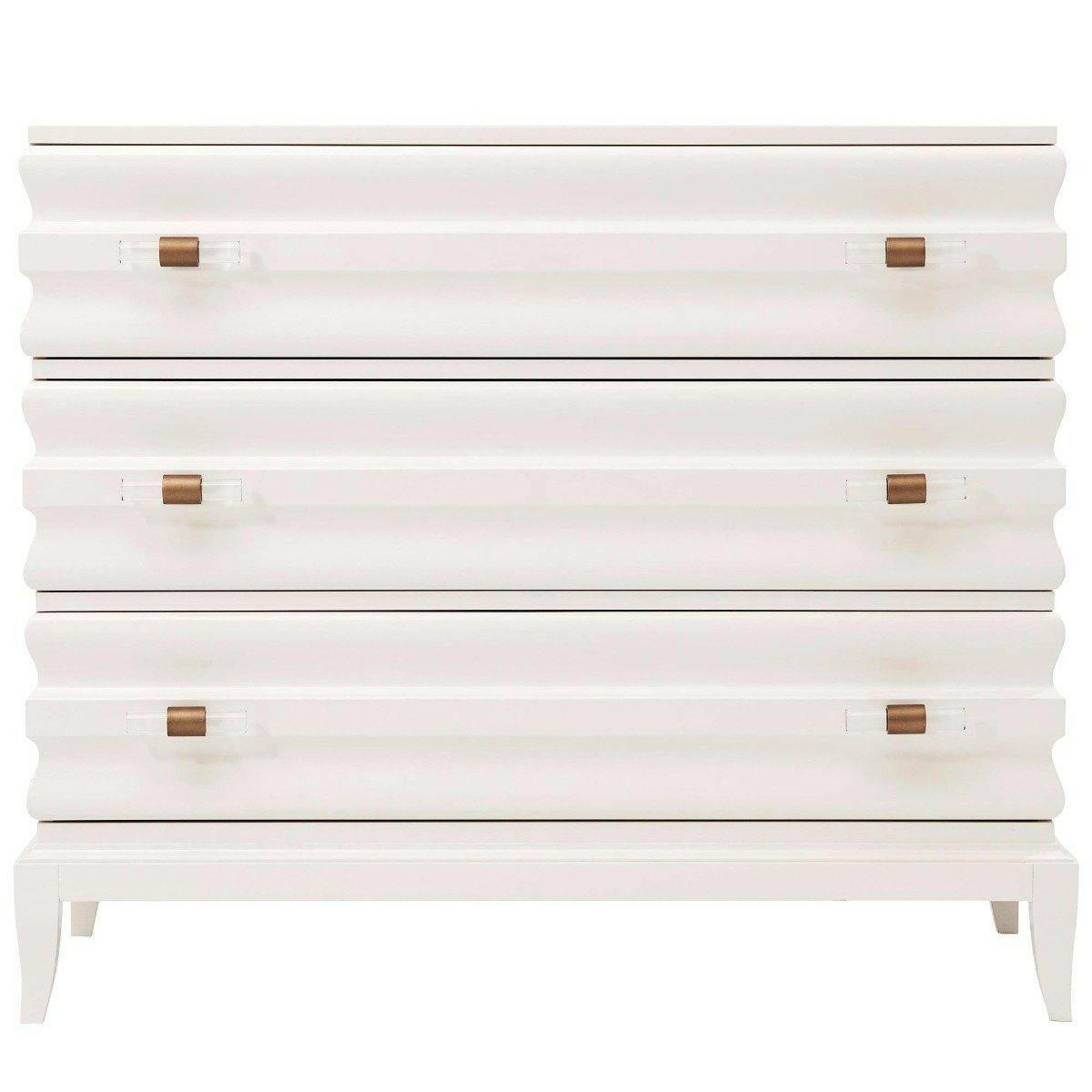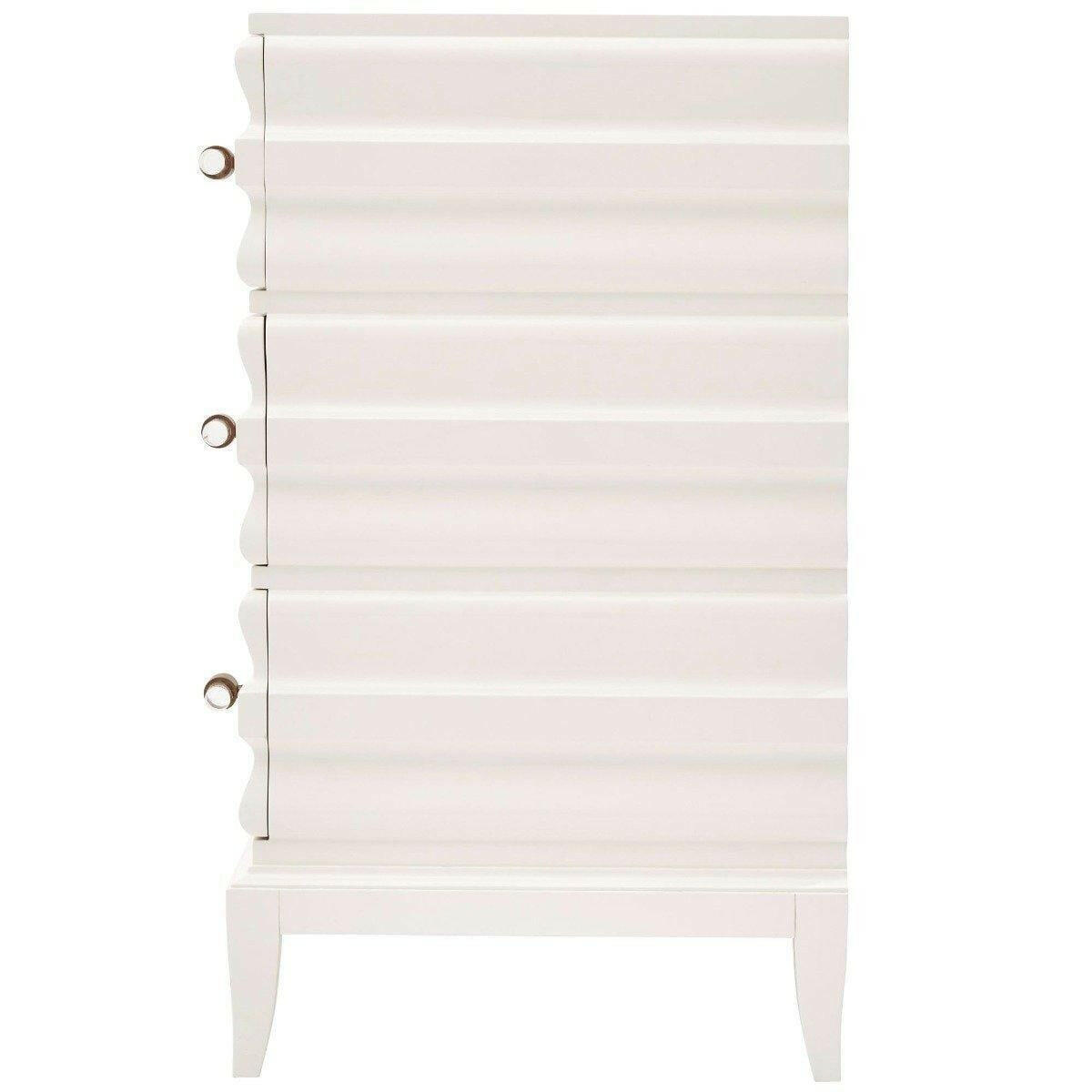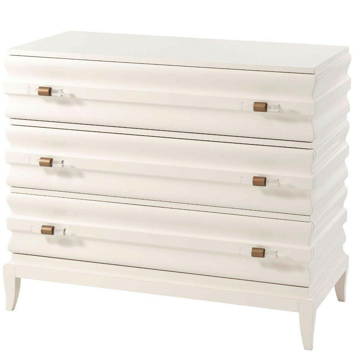The Chest of Drawers Lucienne is a luxurious addition to any home. Its sleek High Gloss Pearl Lacquer finish adds a touch of elegance, while the unique design featuring a rectangular top and ogee molded case and drawers adds a modern twist. The splayed legs and Mid Bronze finish handles with optical glass batons give this piece a sophisticated and stylish look.