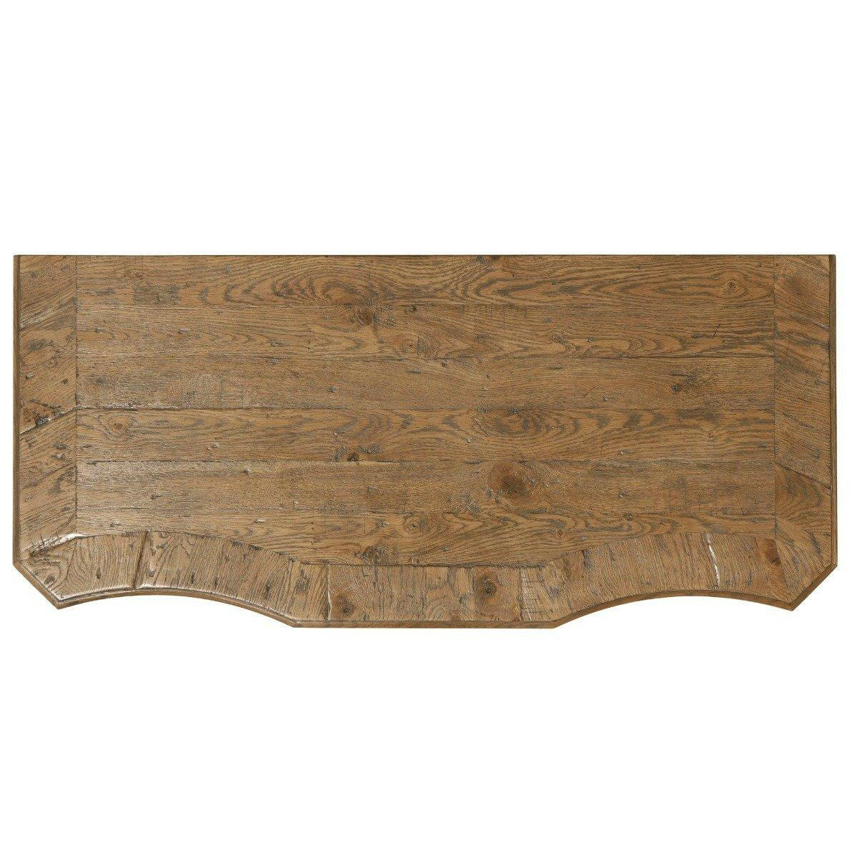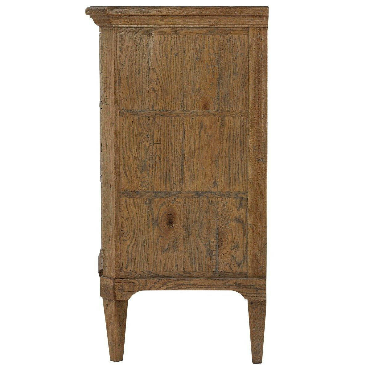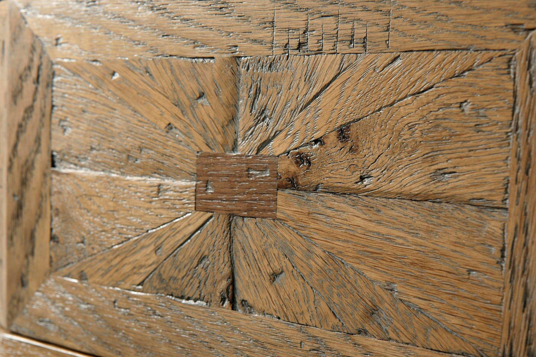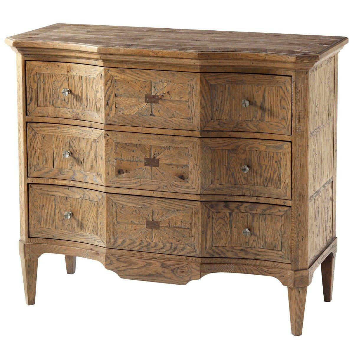 The Chest of Drawers Rollin in Echo Oak from House of Isabella is a stunning piece of furniture that will add warmth and elegance to any room. Its rustic oak and oak parquetry finish, along with walnut details, create a beautiful and unique look. The light echo oak finish adds a touch of sophistication to the design. The chest features a planked top and sides, as well as three shaped panel marquetry drawers, which come together to create a stunning sunburst design. Vintage textured metal knobs and angled square tapering legs complete the charming look of this chest of drawers.