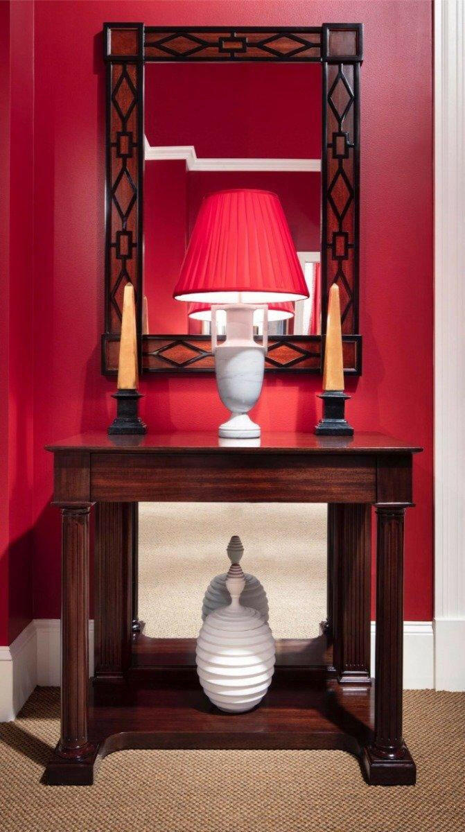 The Console Table Lindsay is a stunning piece of furniture that will add a touch of elegance to any room. Made from high-quality mahogany with a beautiful Cambridge finish, this table features a projecting rectangular molded edge top and a plain frieze with a concealed drawer. The turned and fluted column supports add a touch of sophistication, while the mirror back with fluted pilasters below and concave fronted plinth base add to its luxurious design.