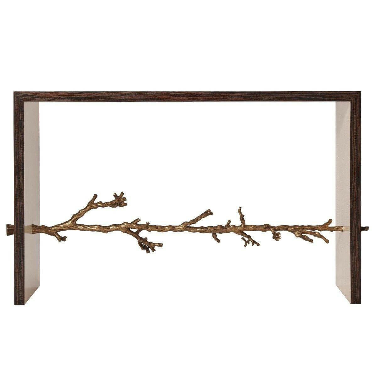 The Theodore Alexander Console Table Spring is a stunning piece of furniture that will add a touch of luxury to any interior. The exterior is made of simulated ebony veneer, giving it a sleek and sophisticated look. The interior is crafted from natural fiddle back sycamore, adding a beautiful contrast to the dark exterior. The table is supported by a cast brass flowering branch stretcher, adding an elegant touch to the overall design. With dimensions of 132.1x45.8x81.3, this console table is the perfect size for any space. Shop now at House of Isabella for free UK delivery on this exquisite piece.