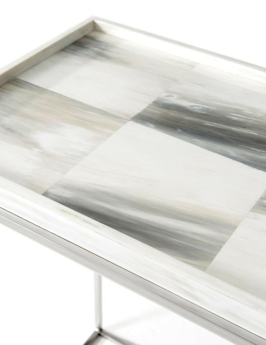 The Quadrilateral Console Table from Theodore Alexander is a stunning addition to any home. With a tray top and rectangular hand painted faux horn tiled top, this table exudes luxury and sophistication. The polished stainless steel cubed base adds a modern touch to the overall design. Measuring 165.1 x 43.2 x 85.1, this console table is the perfect size for any hallway, living room, or entryway. At House of Isabella, we pride ourselves on offering luxurious furniture and interiors with free UK delivery. Elevate your home decor with the Quadrilateral Console Table.