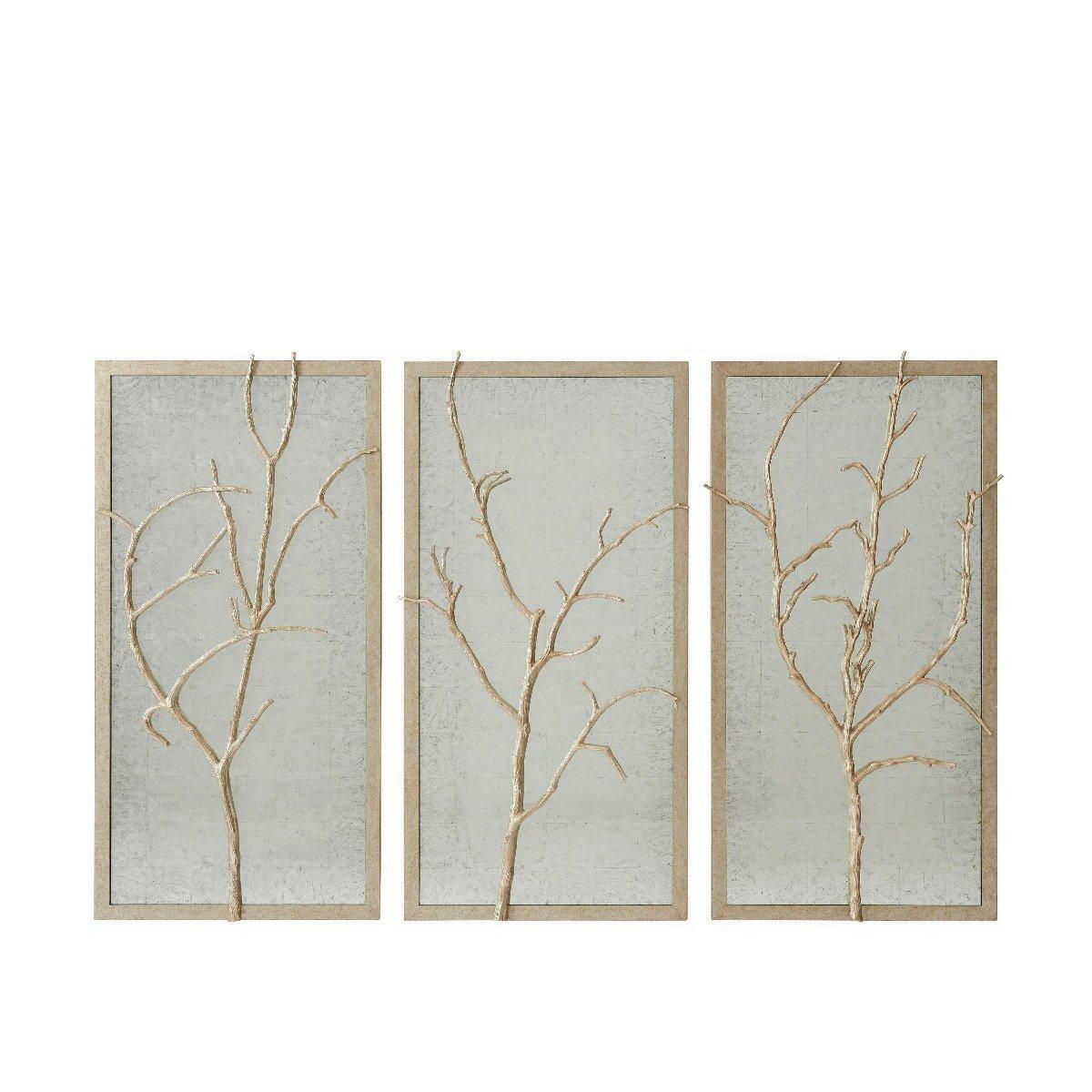 Introduce a touch of elegance and sophistication to your home with the Wall Mirror Hawthorn Trio in Silver from House of Isabella. This set includes three rectangular wall panels, each featuring a silvered metal and silvered wood frame adorned with a cast branch design. The frames are also overlaid on an antiqued hand leafed mirror back, adding a vintage touch to the overall look.
