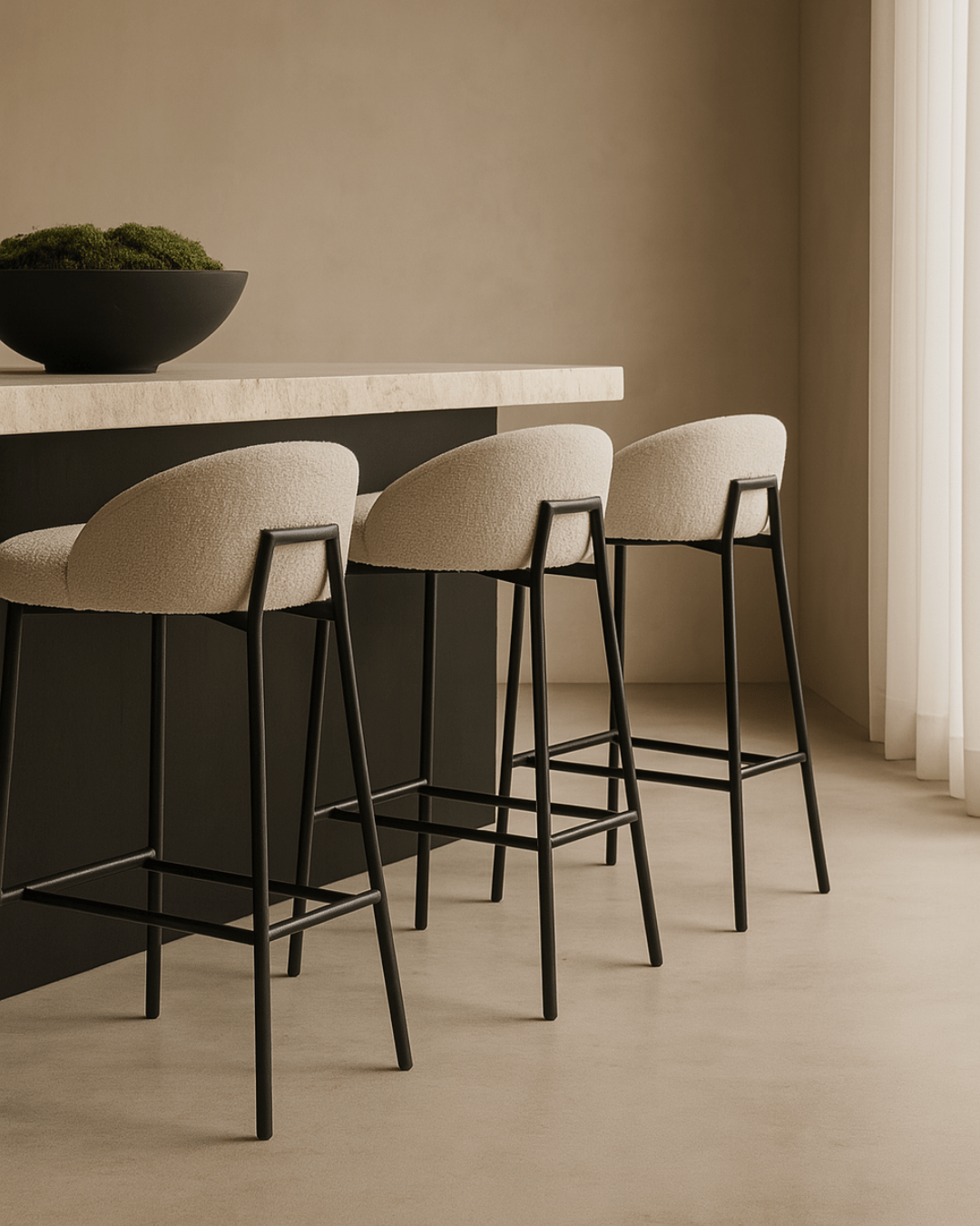 The Tux Counter Stool exudes chic, contemporary sophistication, making it a standout piece in any stylish setting. Its sleek black powder-coated frame and legs provide a modern, minimalist foundation that contrasts beautifully with the luxurious Chex Bouclé upholstery in a pristine polar shade. This combination of textures and tones creates a striking visual appeal, while the plush, high-quality fabric ensures exceptional comfort. Perfect for modern kitchens, bars, or dining areas, the Tux Counter Stool effortlessly elevates the aesthetic of any space with its refined design and elegant detailing.