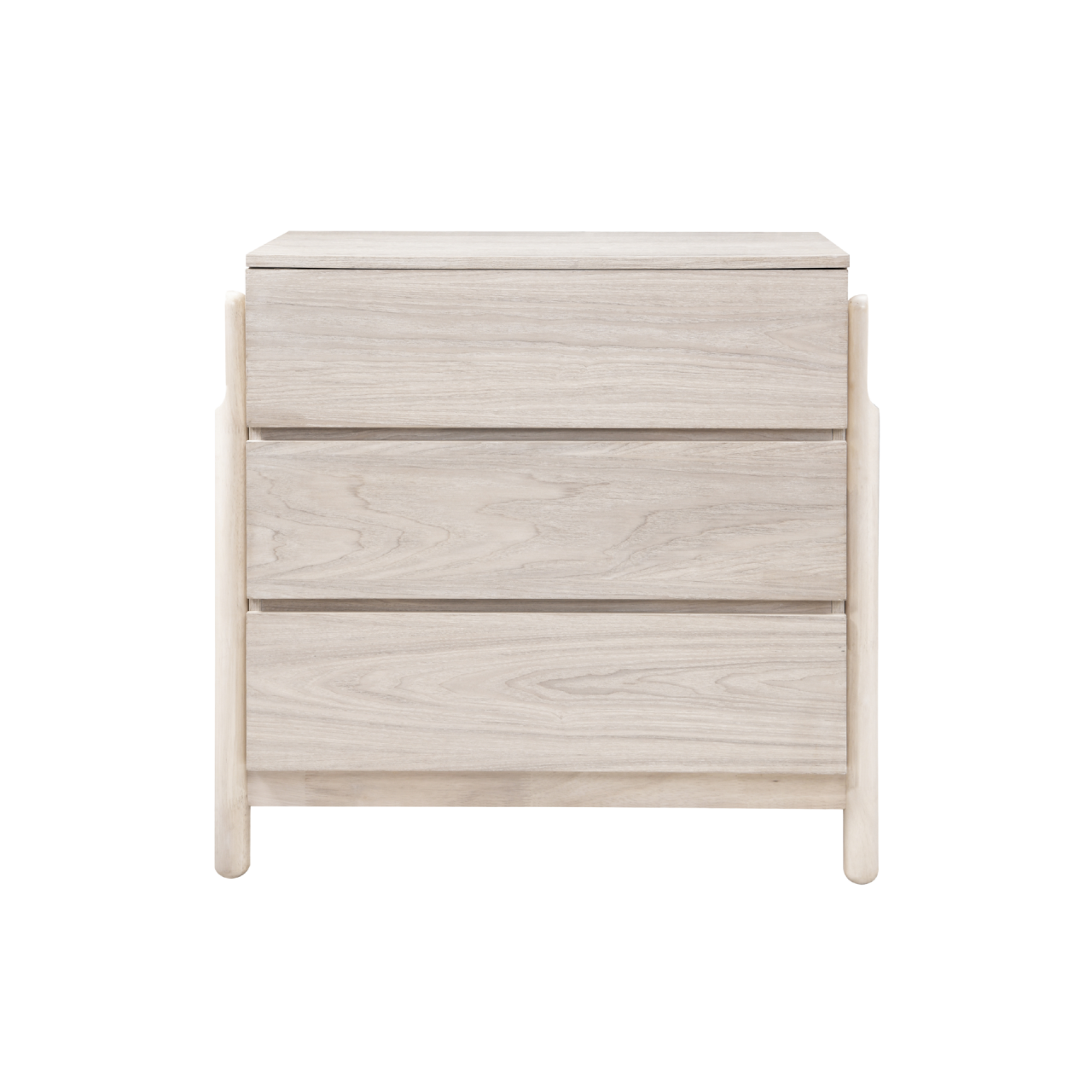 The Whisper 3-Drawer Chest blends functionality and timeless style, making it a perfect addition to any contemporary bedroom. Finished in a classy, white-washed oak colour, this chest offers ample storage with three spacious drawers. Its round wooden legs stand on the outside of the frame, adding elegance and visual interest with their asymmetric shape. Crafted from sustainably sourced materials, this bedside supports eco-friendly living without compromising on style.