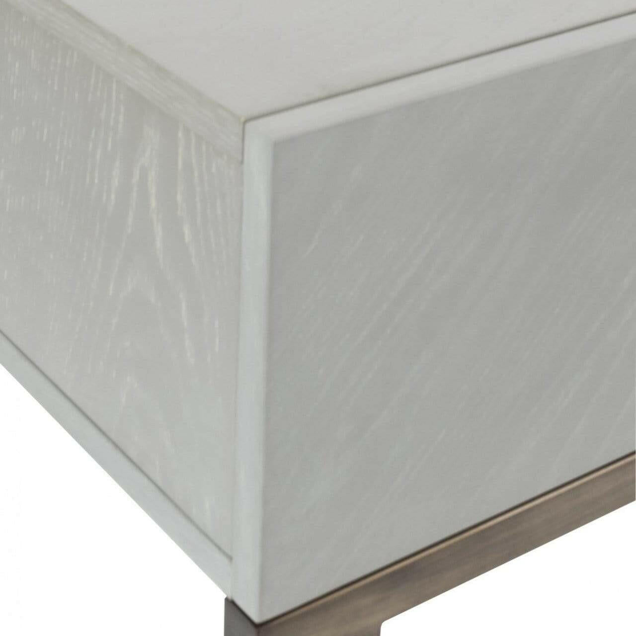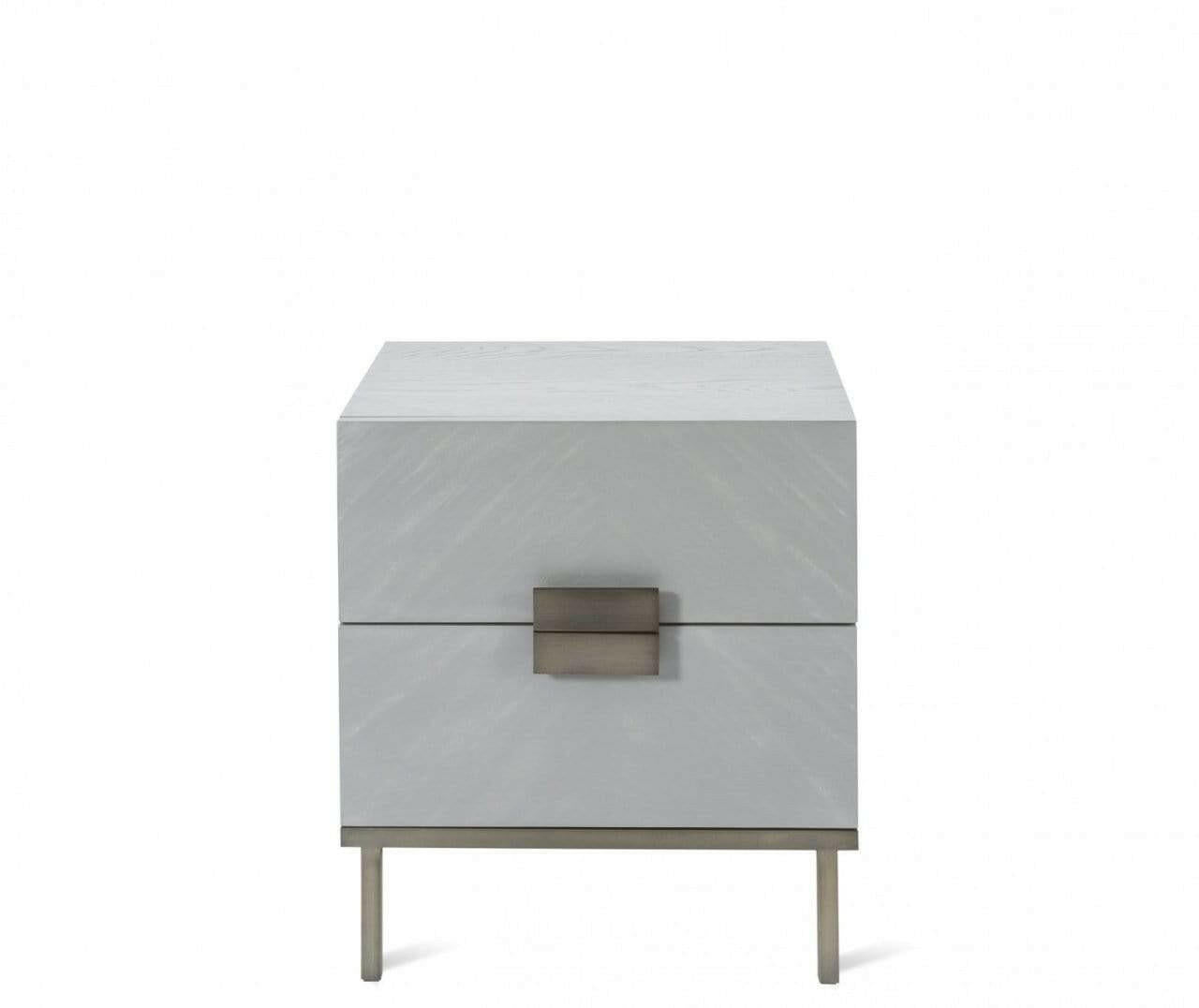 The Lilly Two Drawer Bedside has a sophisticated veneer finish with soft grey tones, wood grain detail and elegant bronze metal handles to make this piece one of a kind.