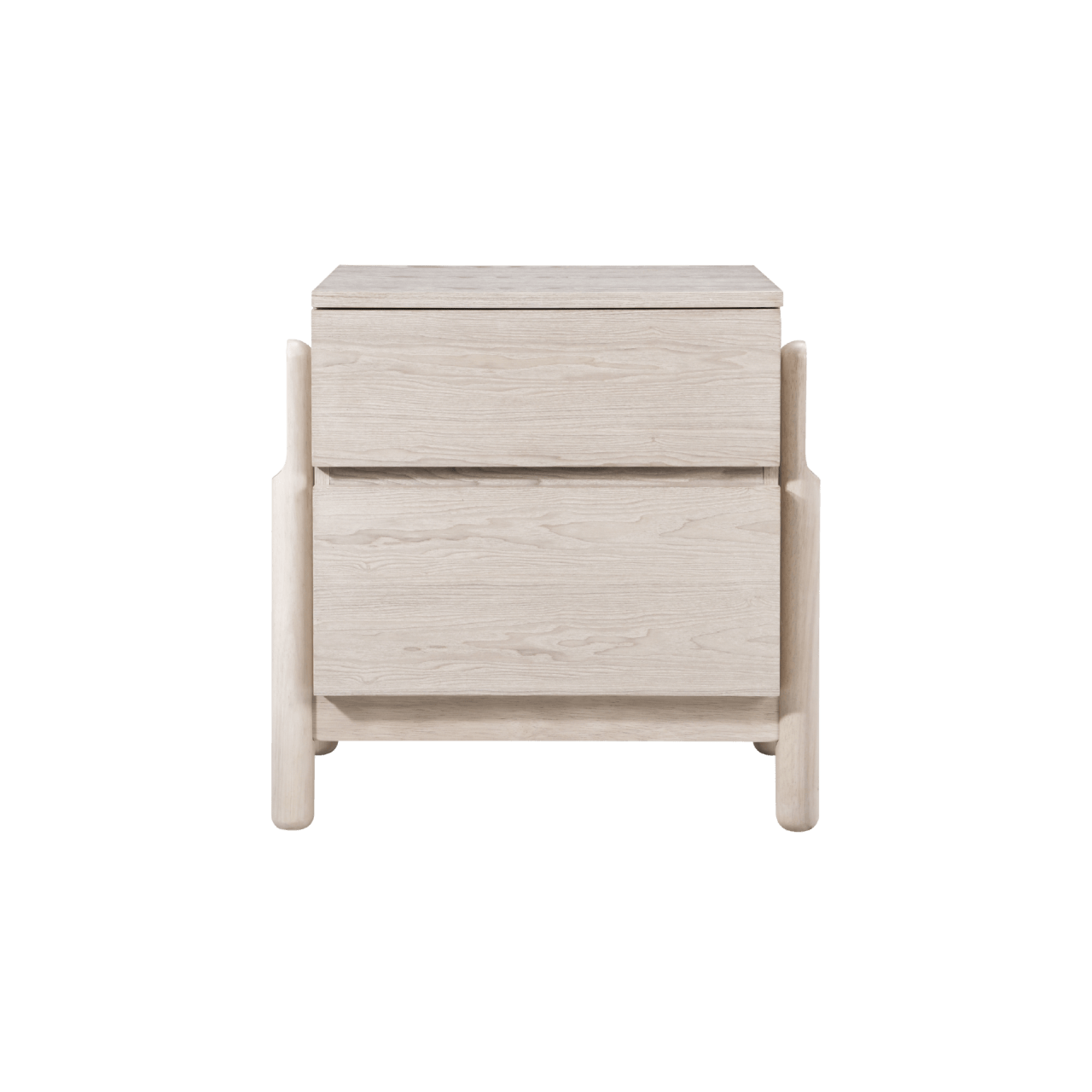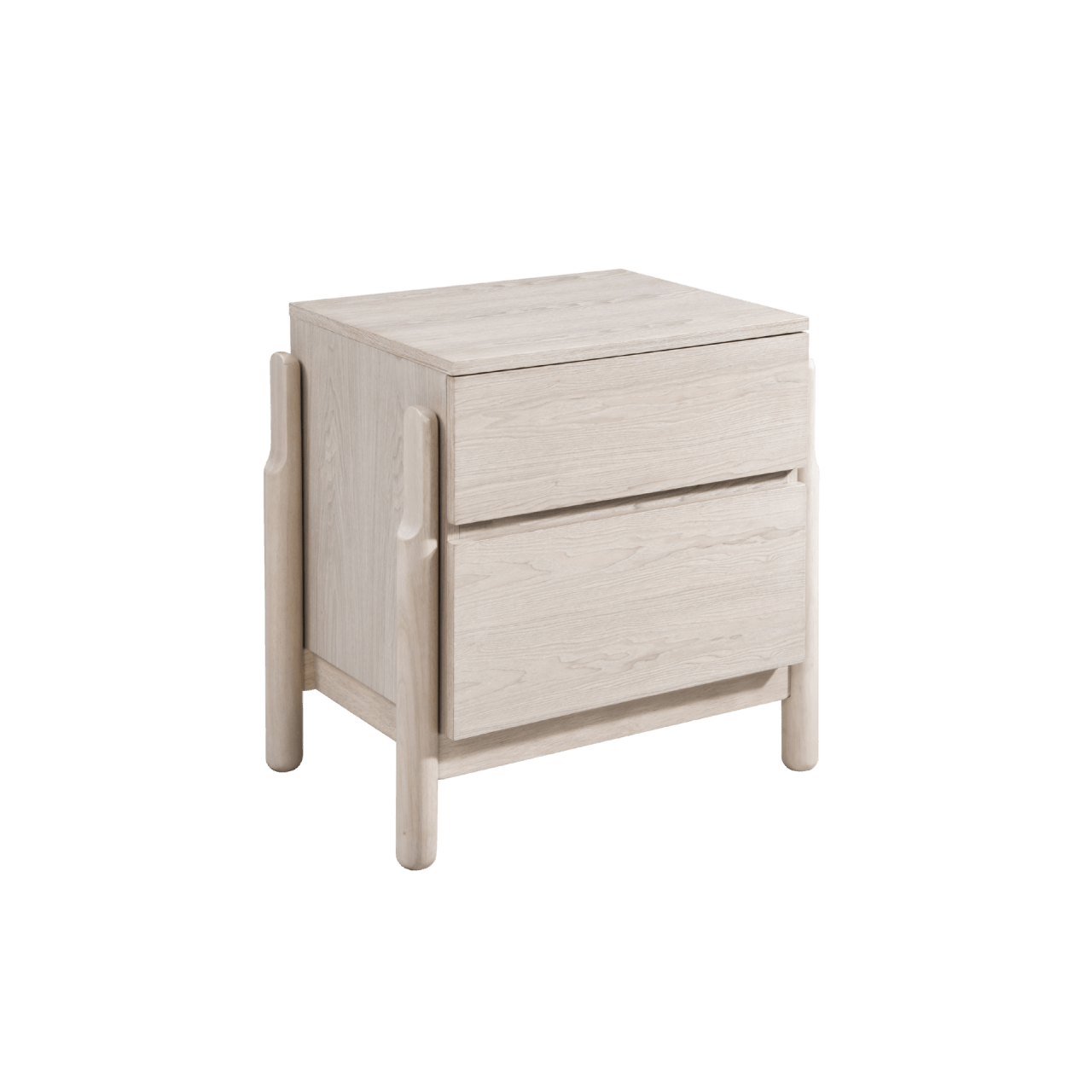 Our Whisper 2-Drawer Bedside combines functionality and timeless style. Finished in a white-washed oak colour, it seamlessly complements modern and Scandinavian interiors. Its round legs stand on the side of the frame, featuring a unique cut-out detail for added visual interest. Crafted from sustainably sourced materials, this bedside supports eco-friendly living without compromising on style.