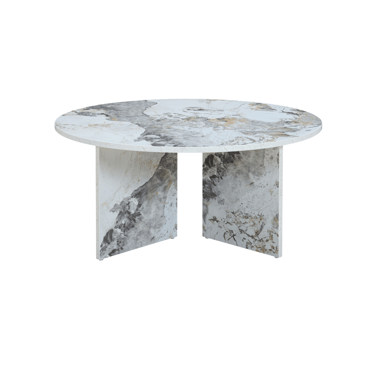 The Aura Circle Coffee Table features a sleek, marble effect finish and a spacious round top. It has 4 rectangular legs, perpendicular to each other, which give it a symmetrical look to match its circular design. This trendy piece is ideal for modern residential spaces, as well as reception and communal areas. Made with durable materials, it provides a sustainable solution for contemporary interiors.