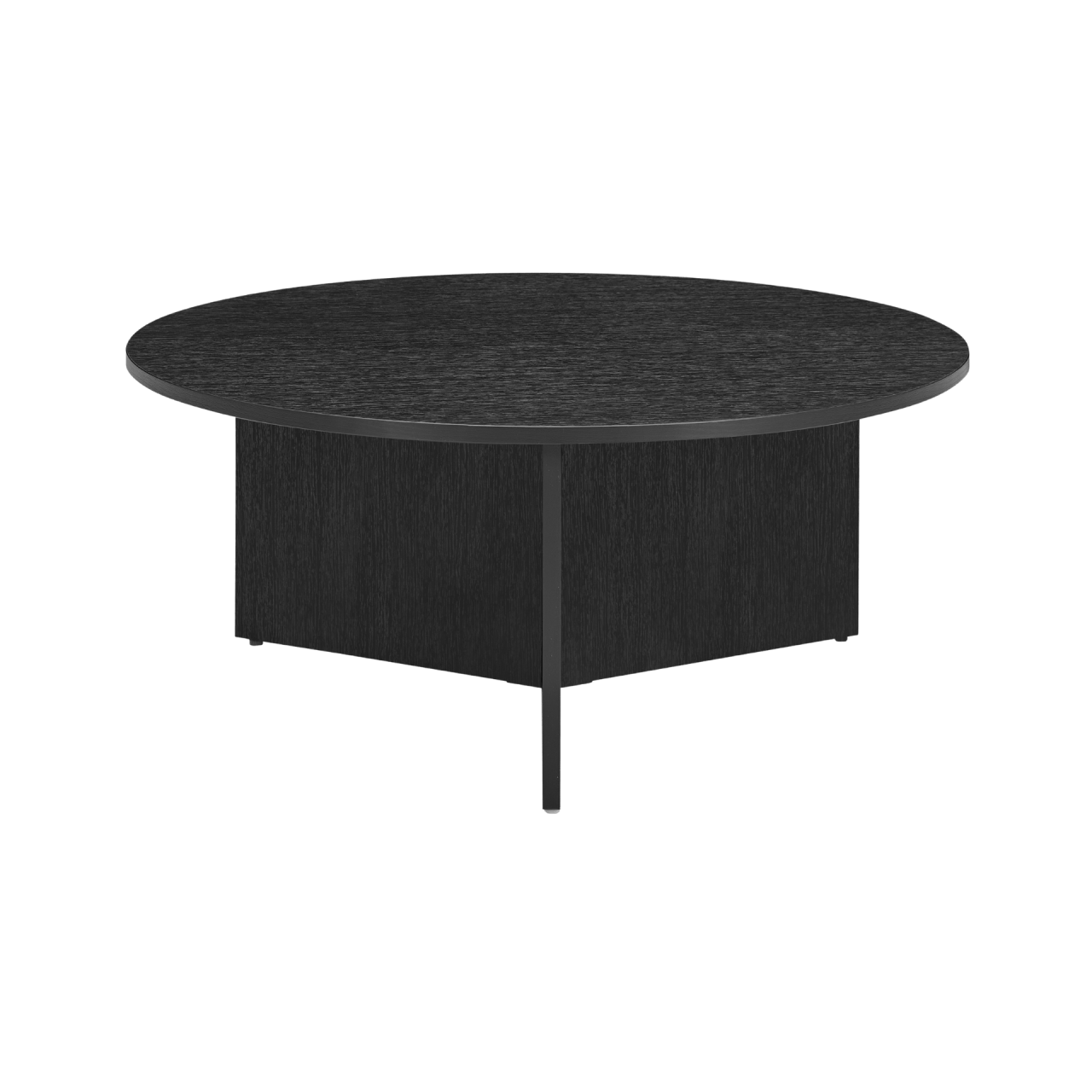 The Nova Coffee Table is stylish and timeless. It features a round tabletop and three rectangular legs which form a distinctive three-pointed star shape at the base, adding a touch of structural elegance. Finished in a classy black with a textured woodgrain effect, this table brings a refined look to both residential spaces and view units. Constructed with durable materials, it promotes sustainability and long-lasting appeal.