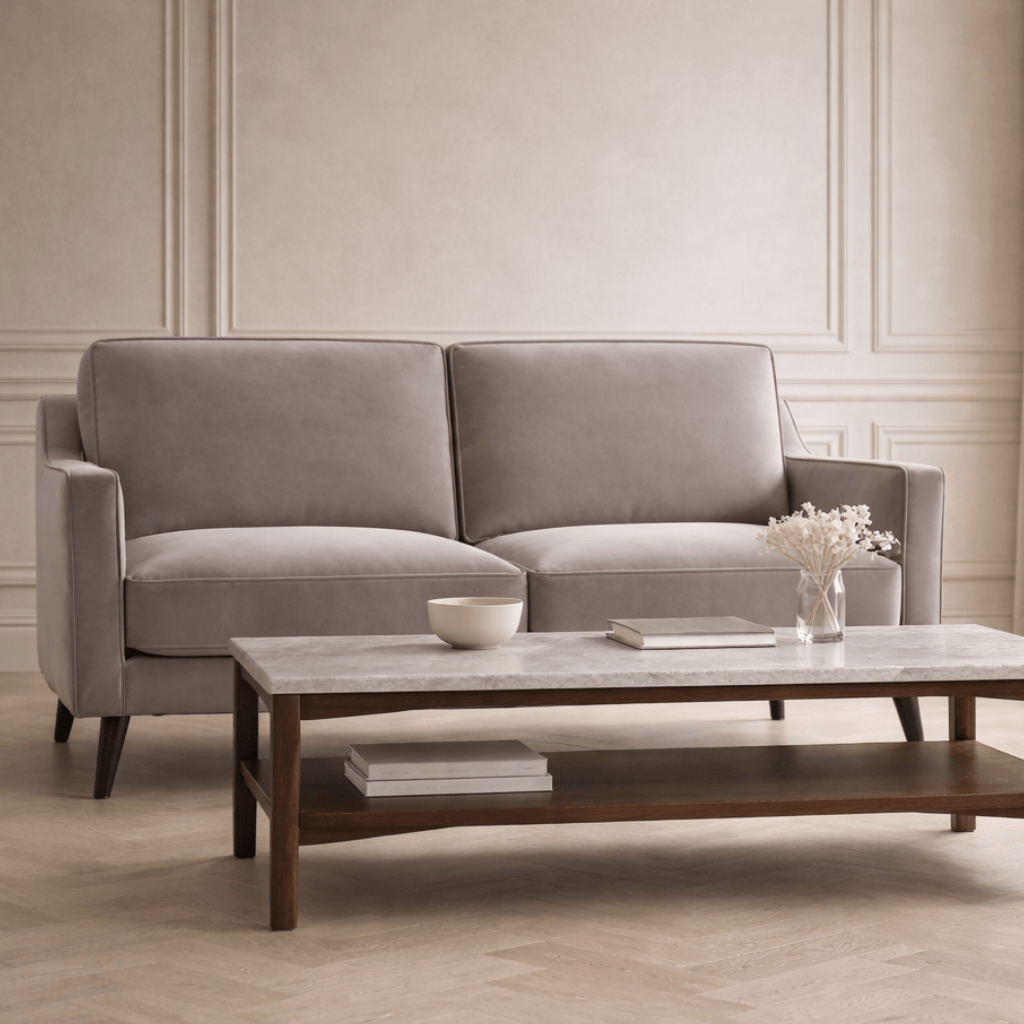 The Daffy Sofa is a luxurious and elegant compact sofa, with its unique curved arms and black modern angular legs. Its clean lines and sleek design create a focal point for any living space. The Daffy Sofa is finished in a sophisticated Mink soft velvet fabric and Greige linen Fabric.