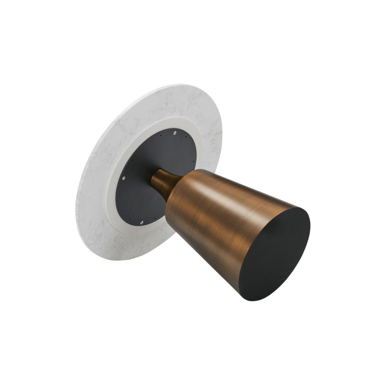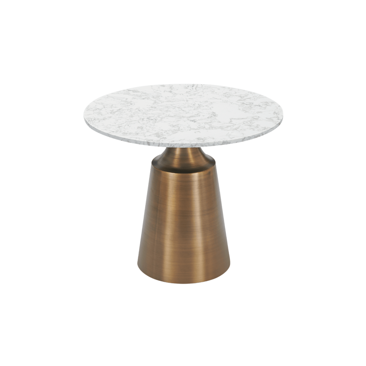 The Olive Dining Table is a modern round table featuring an antique bronze coloured column base and a round white artificial marble top. It's durable and easy to maintain, making it perfect for everyday use. This table will add a stylish and functional centrepiece to any dining room.