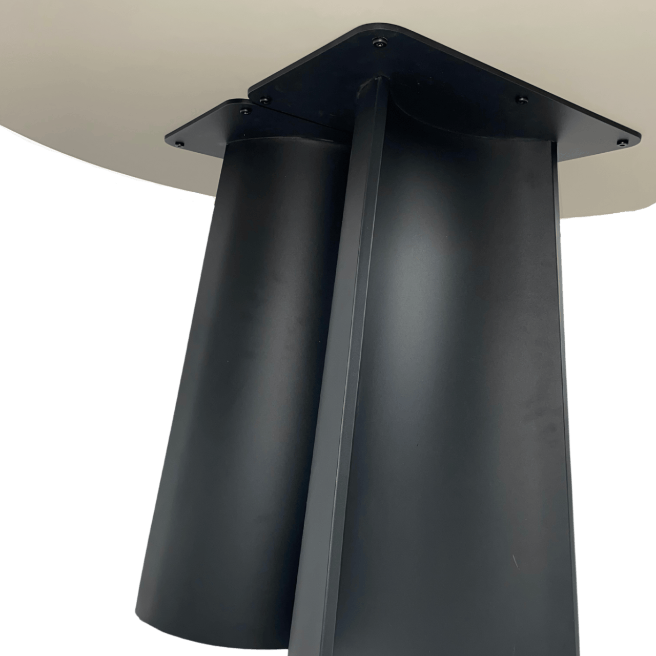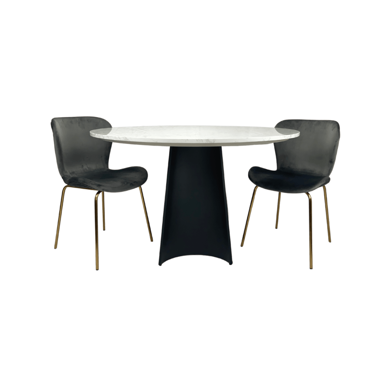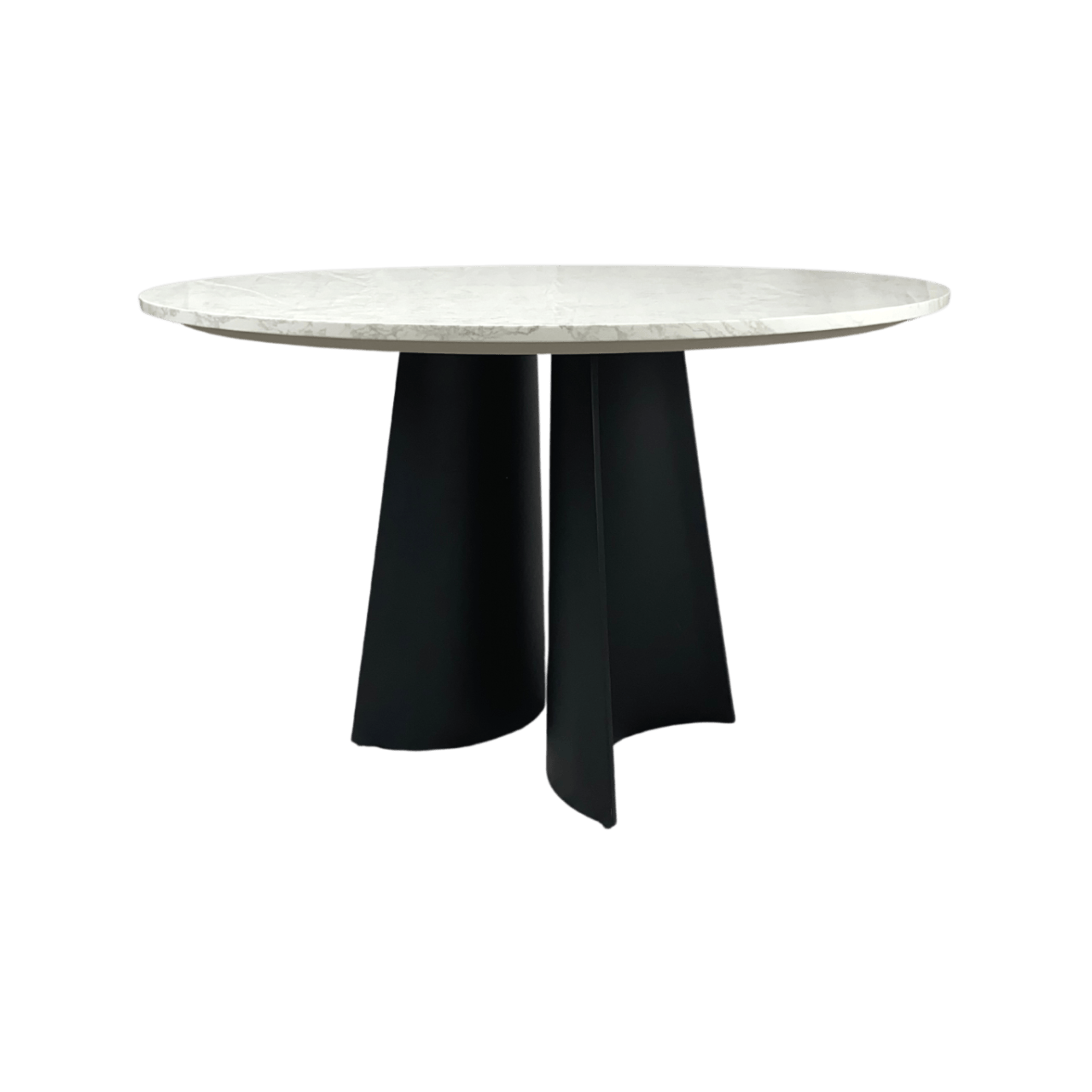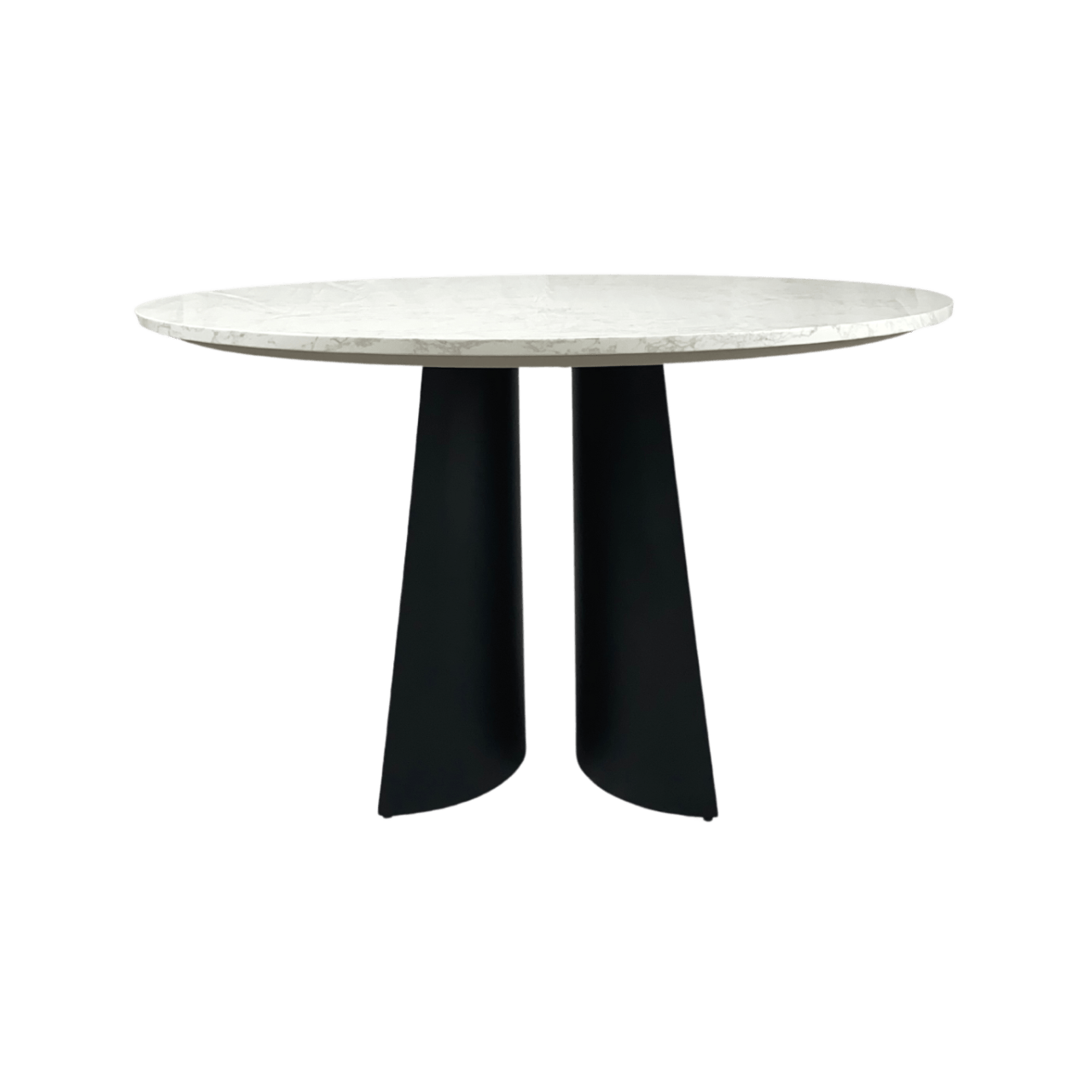 The Rosemary Round Dining Table is a stylish post-modern piece of furniture that would be the ideal fit for any modern, minimalist dining room. It's spacious round top is made from artificial marble, which is ideal for kitchen settings because it is easy to clean and does not stain like regular marble. The top sits on an MDF board attached to two semi-conical legs of black, powder-coated metal. They are thick and hollow, to not weigh too much and have small protector pads at the bottom to protect the floor from scratching. Their dark colour contrasts with the white marble top, giving the Rosemary table an engaging, neutral look.